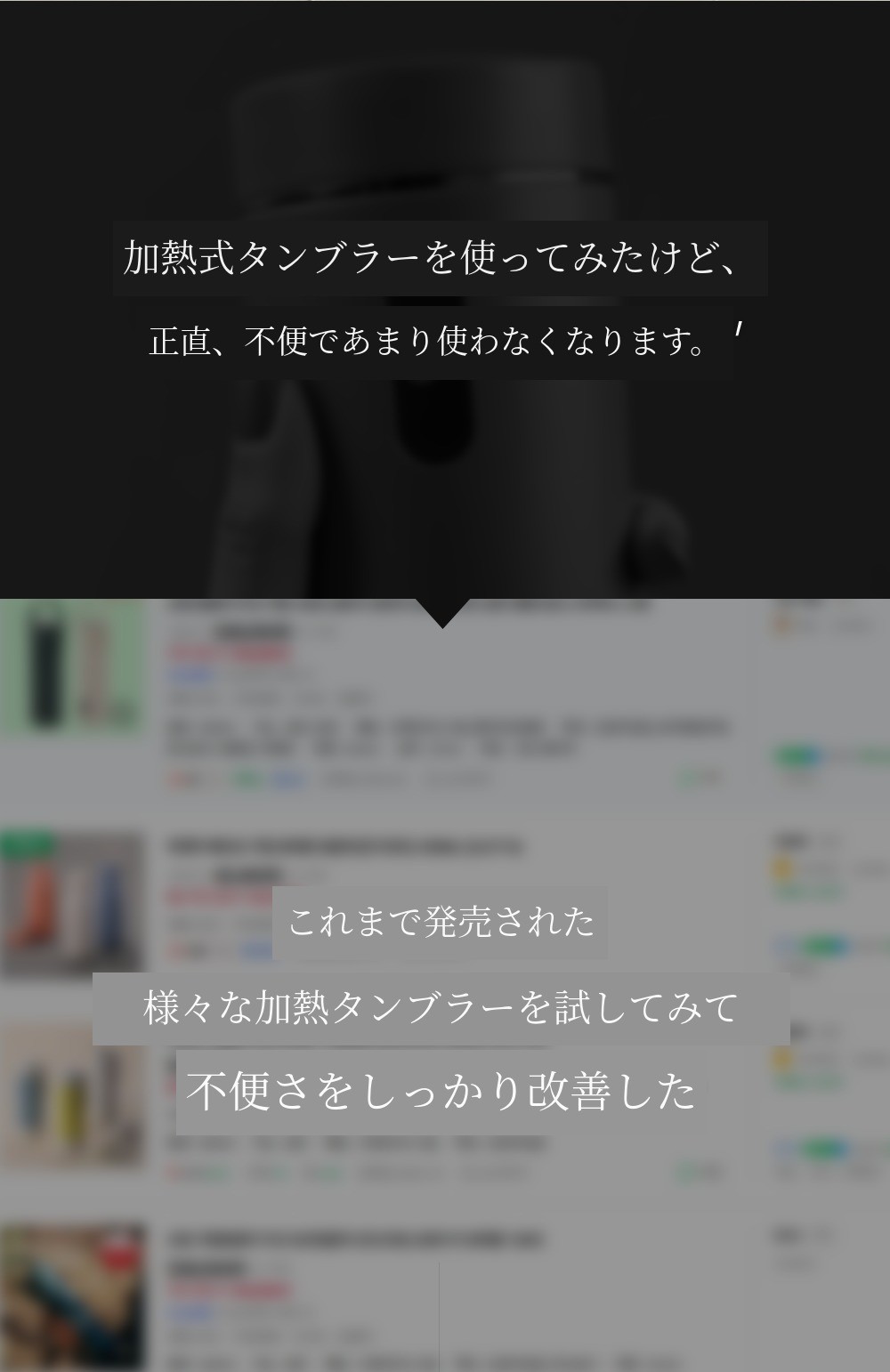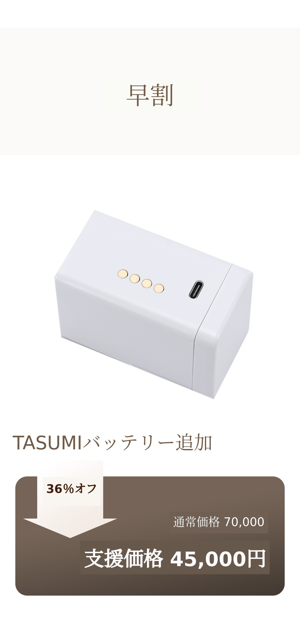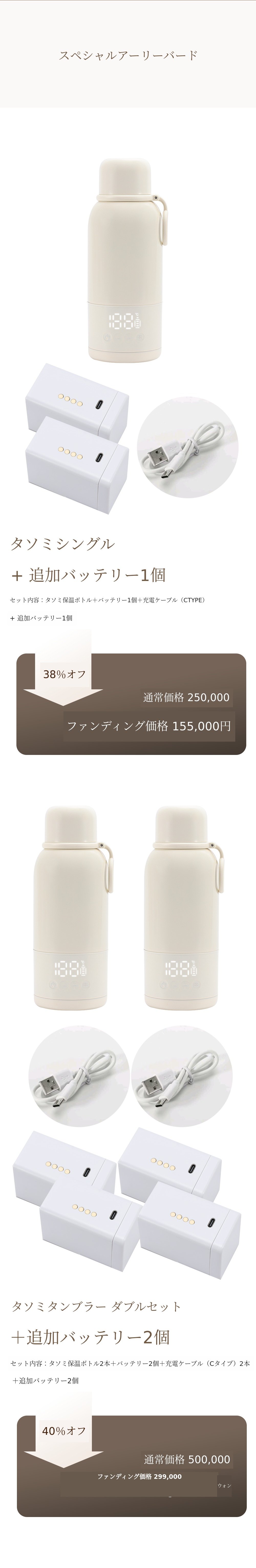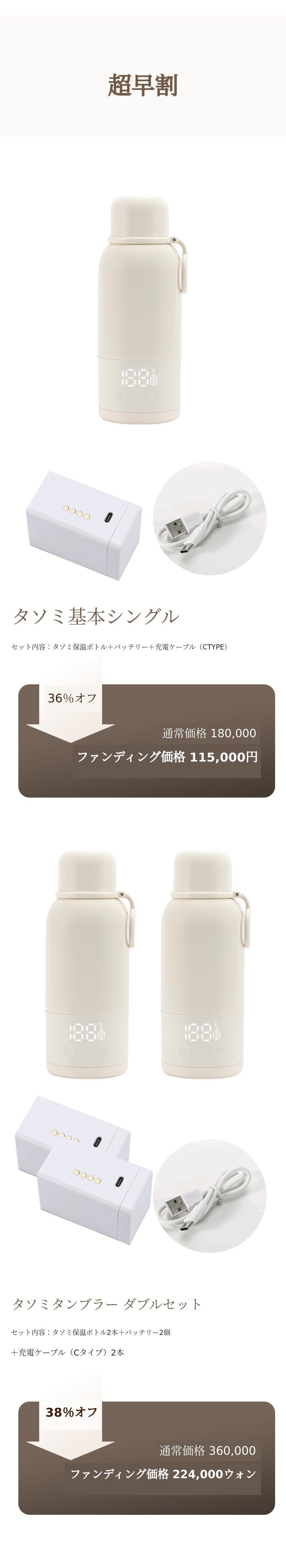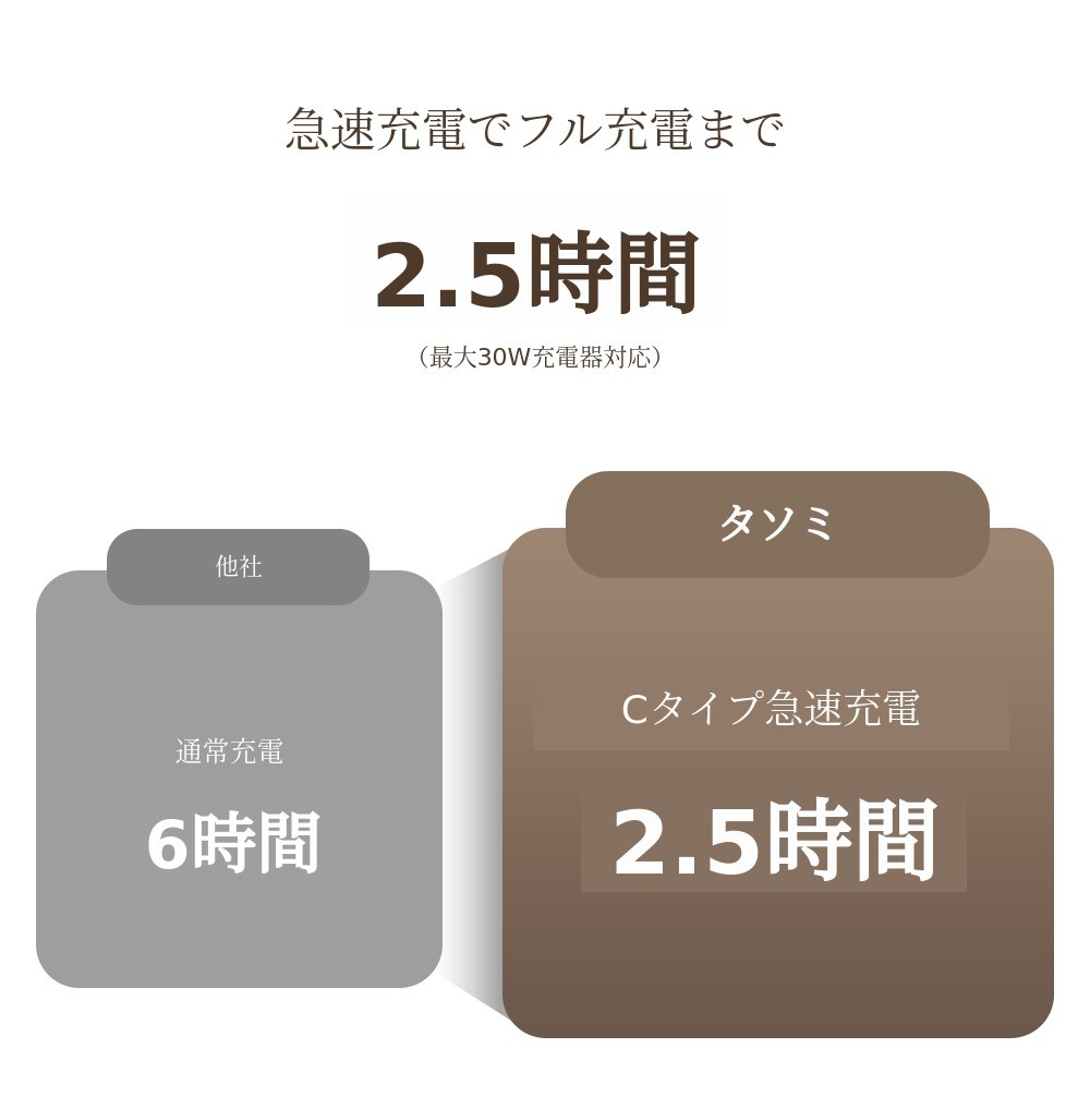 タンブラー本体と接続して充電する場合、充電端子の接触不良や充電不良が発生することが多いです。実際に他社製品ではこのようなCSが多く発生しています。しかしタソミは製品ではなくバッテリーを分離してバッテリー自体で充電する方式なので、充電不良や接触不良が発生しません。