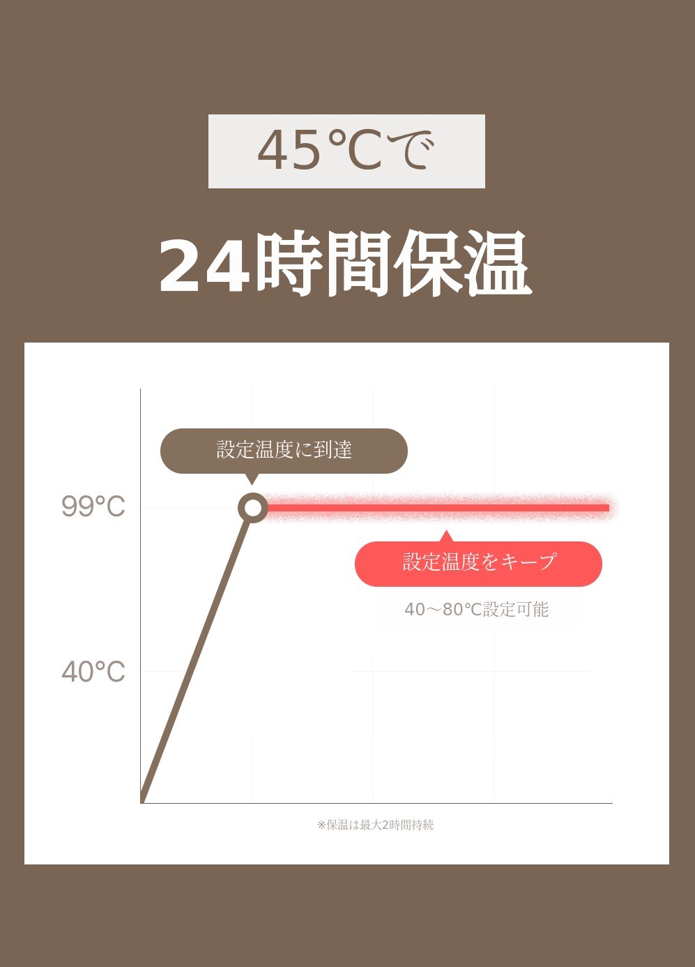 100度に達すると自動的に45度の保温に切り替わります。そして基本の保温時間は24時間維持されます。優れた保温力で屋外でも使いやすいです。