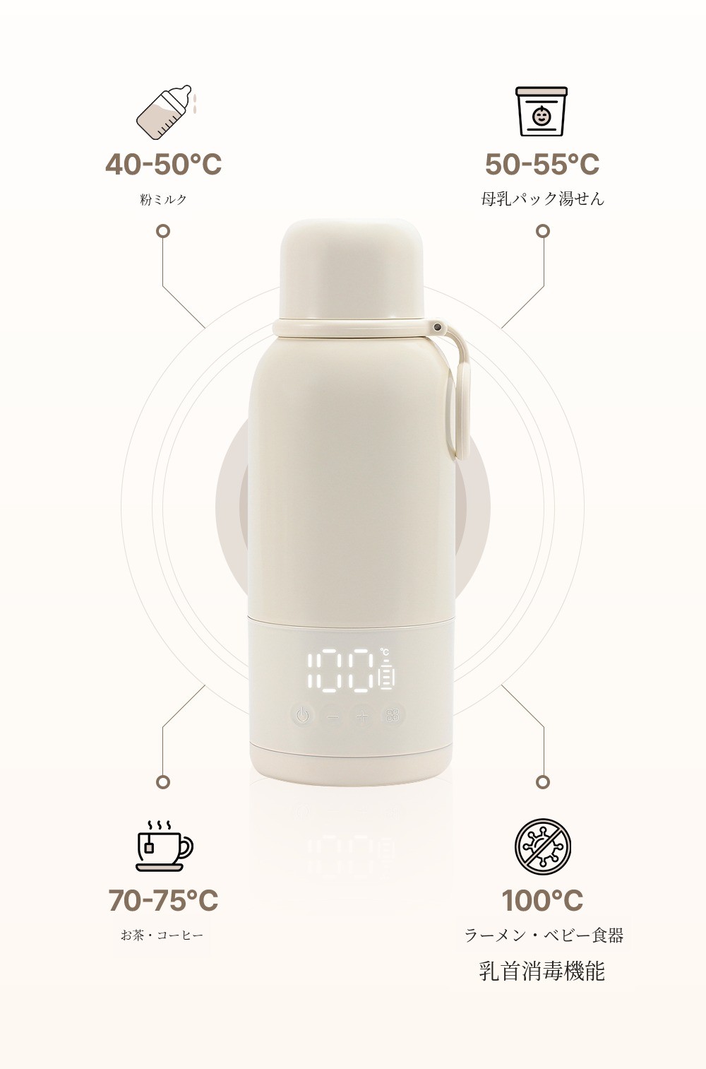 6. 機能ボタンを押して37℃、40℃、45℃、50℃、55℃、65℃、100℃など7つの温度設定を素早く選択可能。温度選択後、製品が3回点滅し、その温度に設定されます。100℃に達すると3回鳴り、自動で45℃の保温に切り替わります。