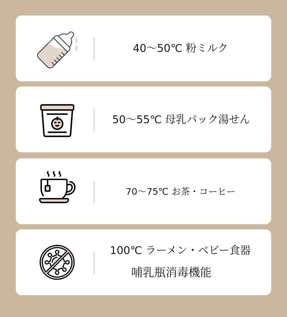 特に粉ミルクの場合、適切な温度で溶かすためには水温が40~50度の間でなければなりません。そのため、繊細な温度調節が可能であってこそ、粉ミルクの栄養素を壊さずに溶かすことができるのです。
