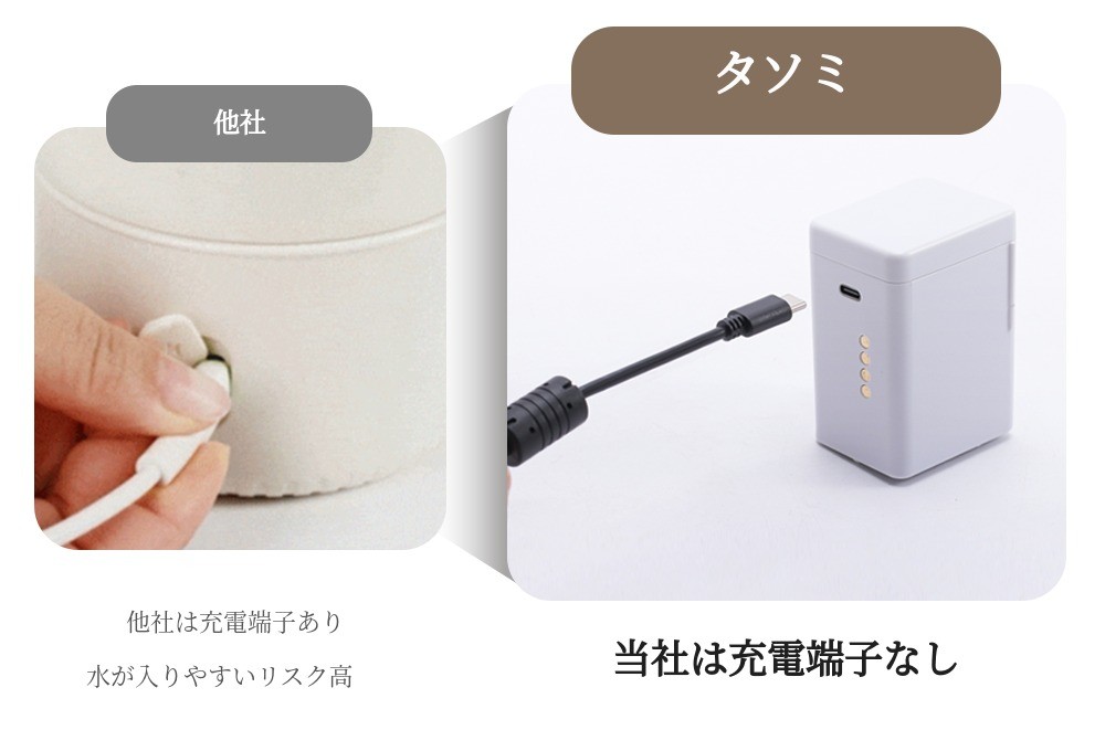 他社製品は外部に充電端子が露出しているため、他社製品は洗浄時に充電端子に水が入る可能性があります。しかしタソミはバッテリー分離型で本体外部に充電端子がないため、洗浄がはるかに簡単です。