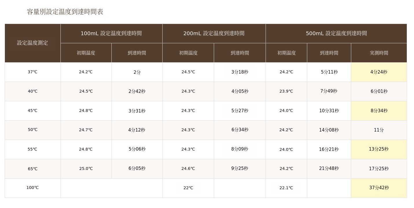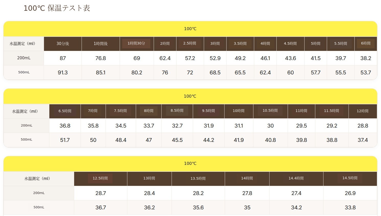 * 電源なしで100度タンブラーとして使用時、30分ごとの温度測定表