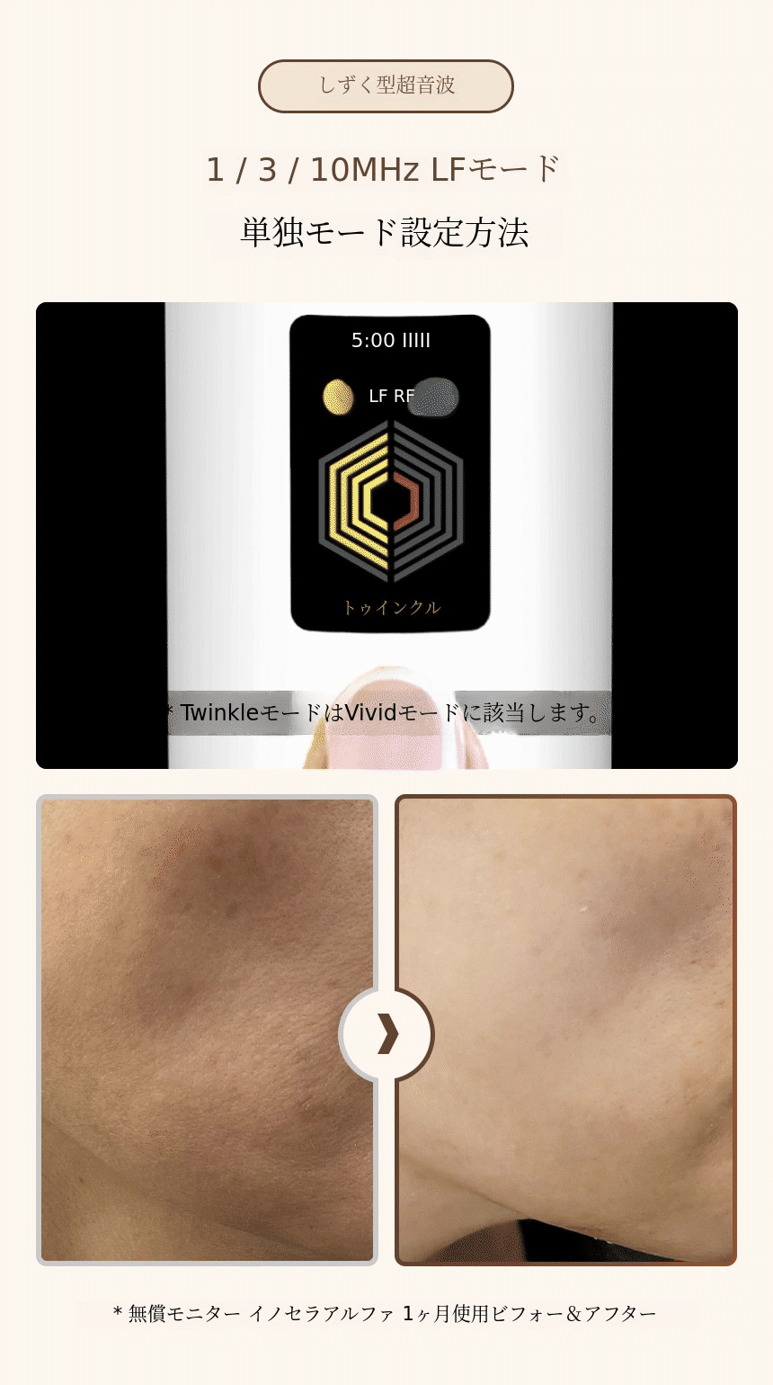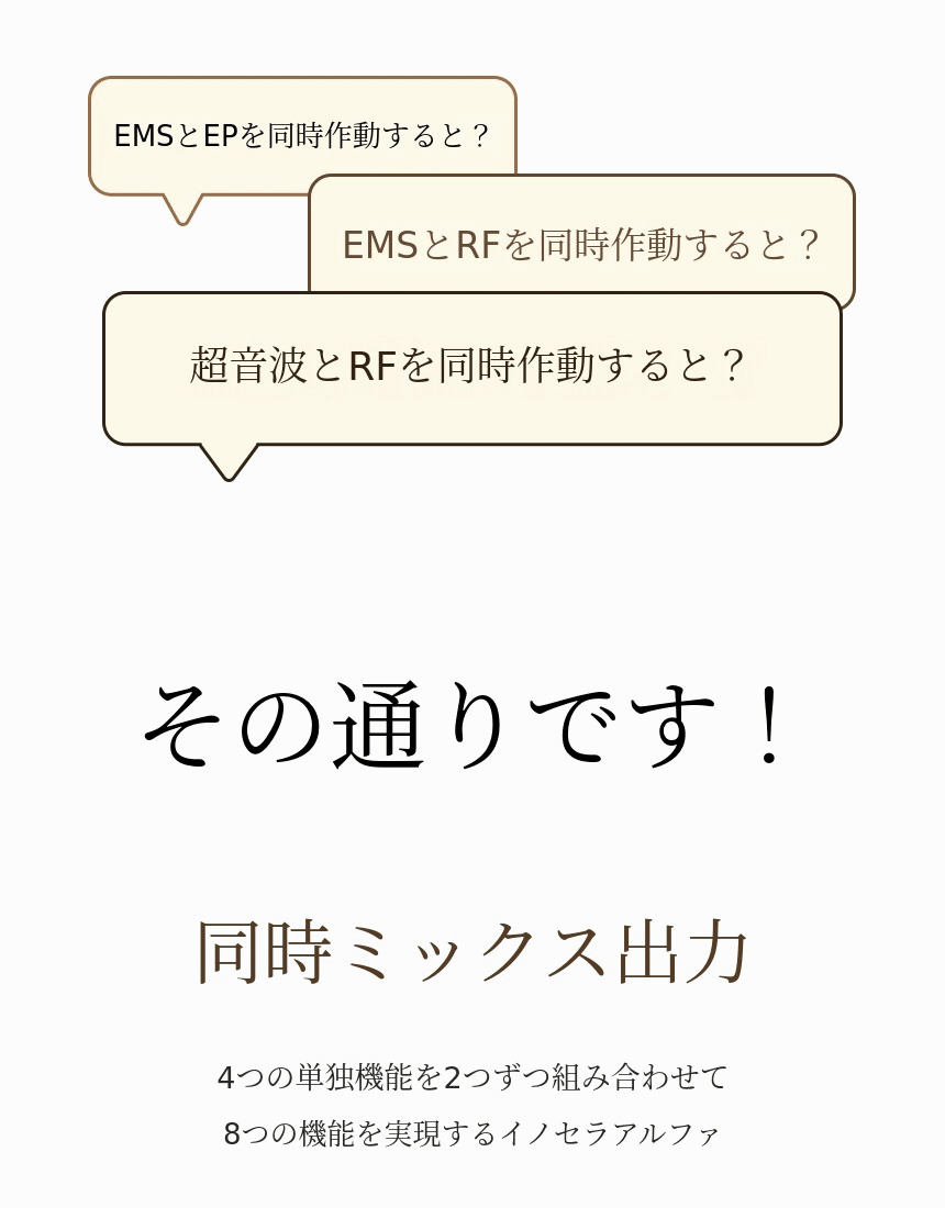 イノセラアルファはウォータードロップ超音波、高周波、中周波EMS、エレクトロポレーション、IR LED