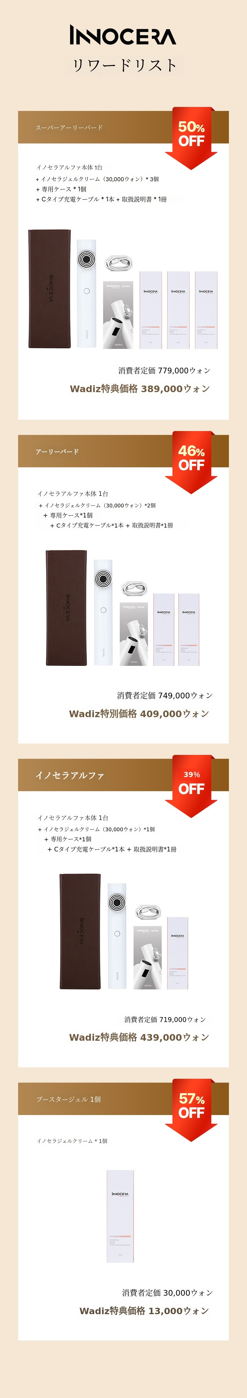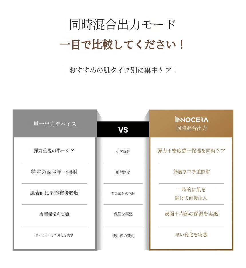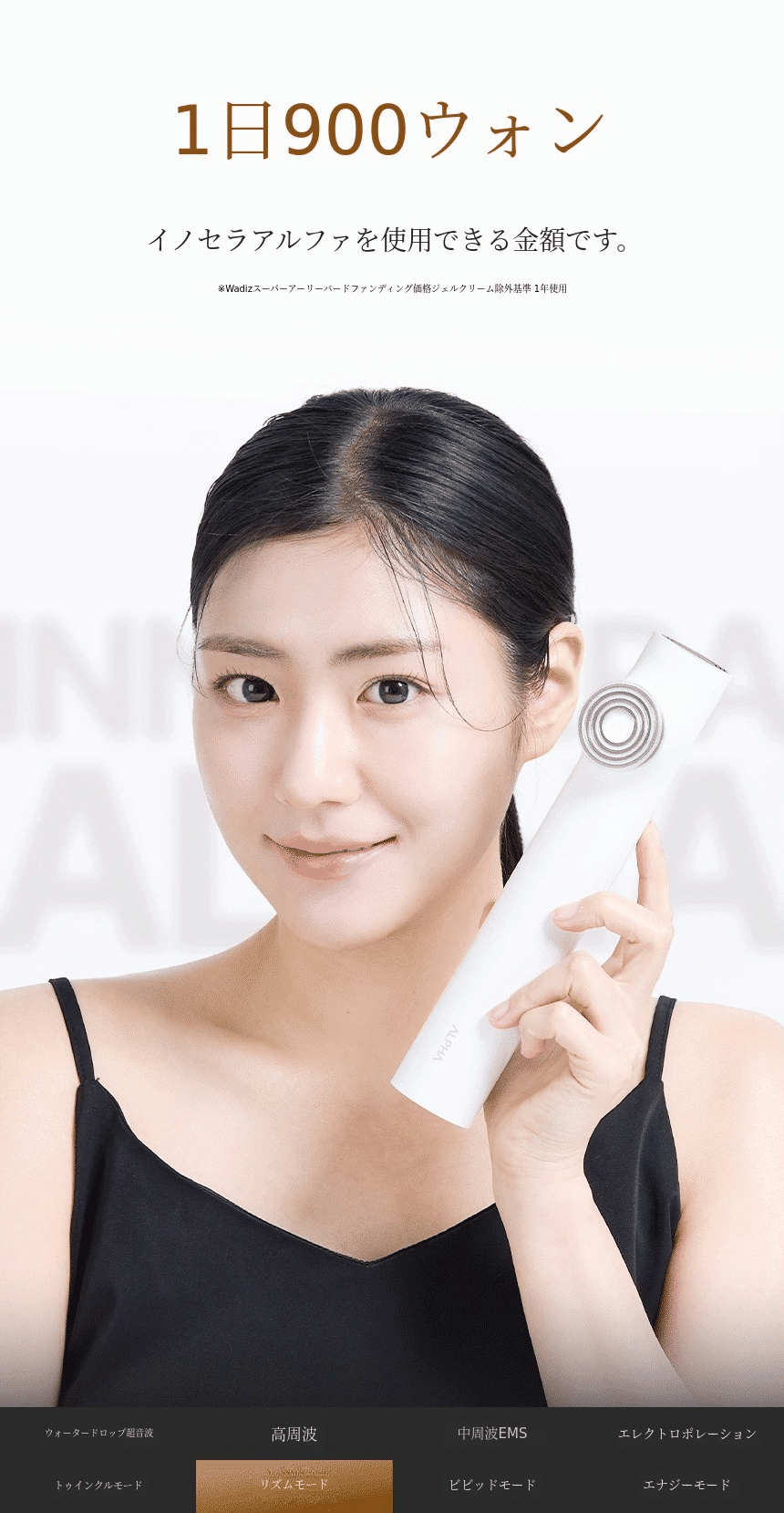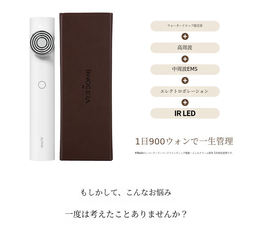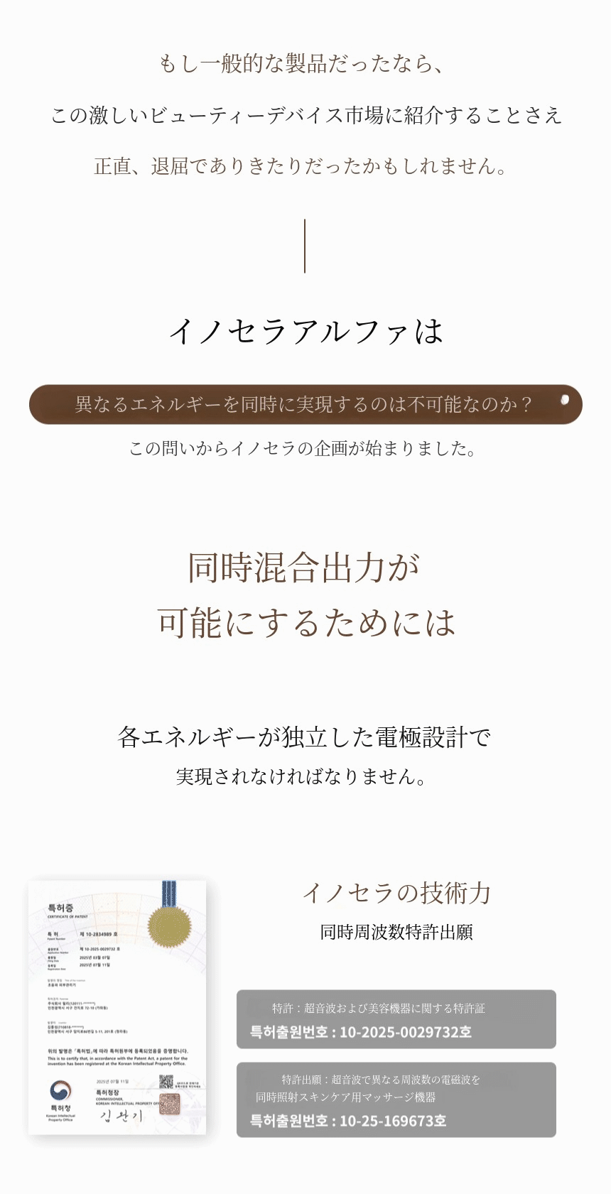 Wadizで初めて披露するイノセラアルファは、従来になかった「同時混合出力」技術を採用した革新的なビューティーデバイスです。ウォータードロップ超音波、高周波、中周波、EP、IR LEDなど、皮膚科やエステで体験していた主要機能を1台に集約し、複数のケアを別々に受ける必要なく同時にケアできるよう設計されています。忙しい現代人がビューティーデバイスの使用にかける時間を減らし、効果を最大化できる製品です。