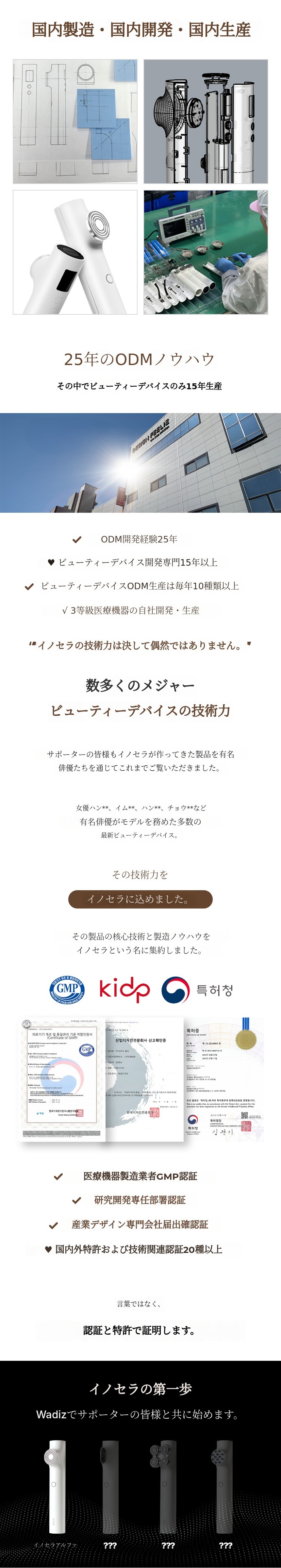 **INNOCERA(イノセラ)**は25年間、医療機器および美容機器を自社で開発・製造してきた専門製造企業です。短期間で作られたブランドとは異なり、長年蓄積してきた技術力と製造ノウハウを基に、差別化された競争力を備えています。これまで多数の有名ビューティーブランド製品を製造・納品し、技術力を証明してきました。このような経験とノウハウを集約し、自社ブランド**イノセラ(INNOCERA)**をお披露目することになりました。