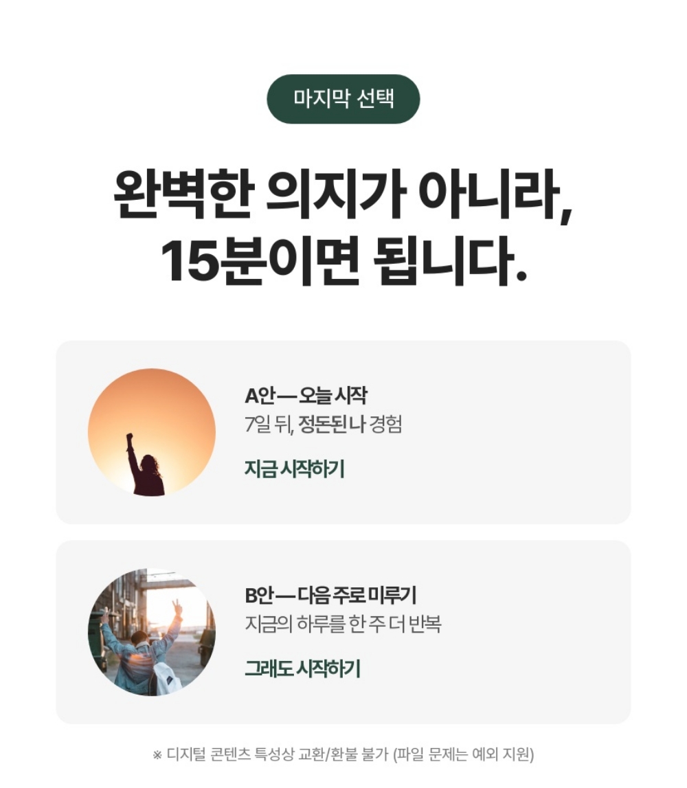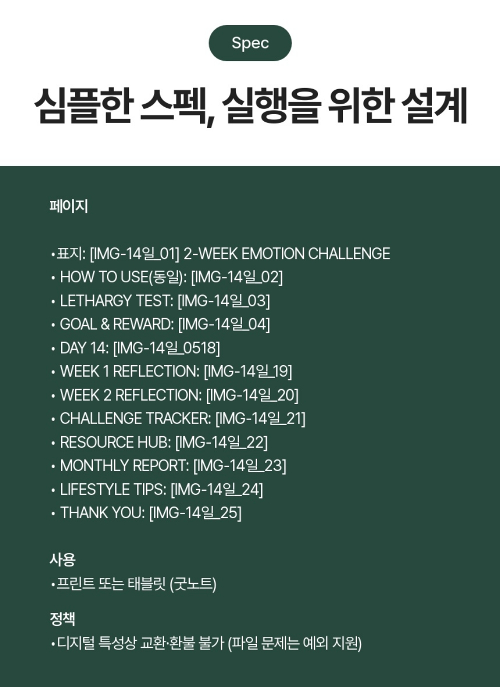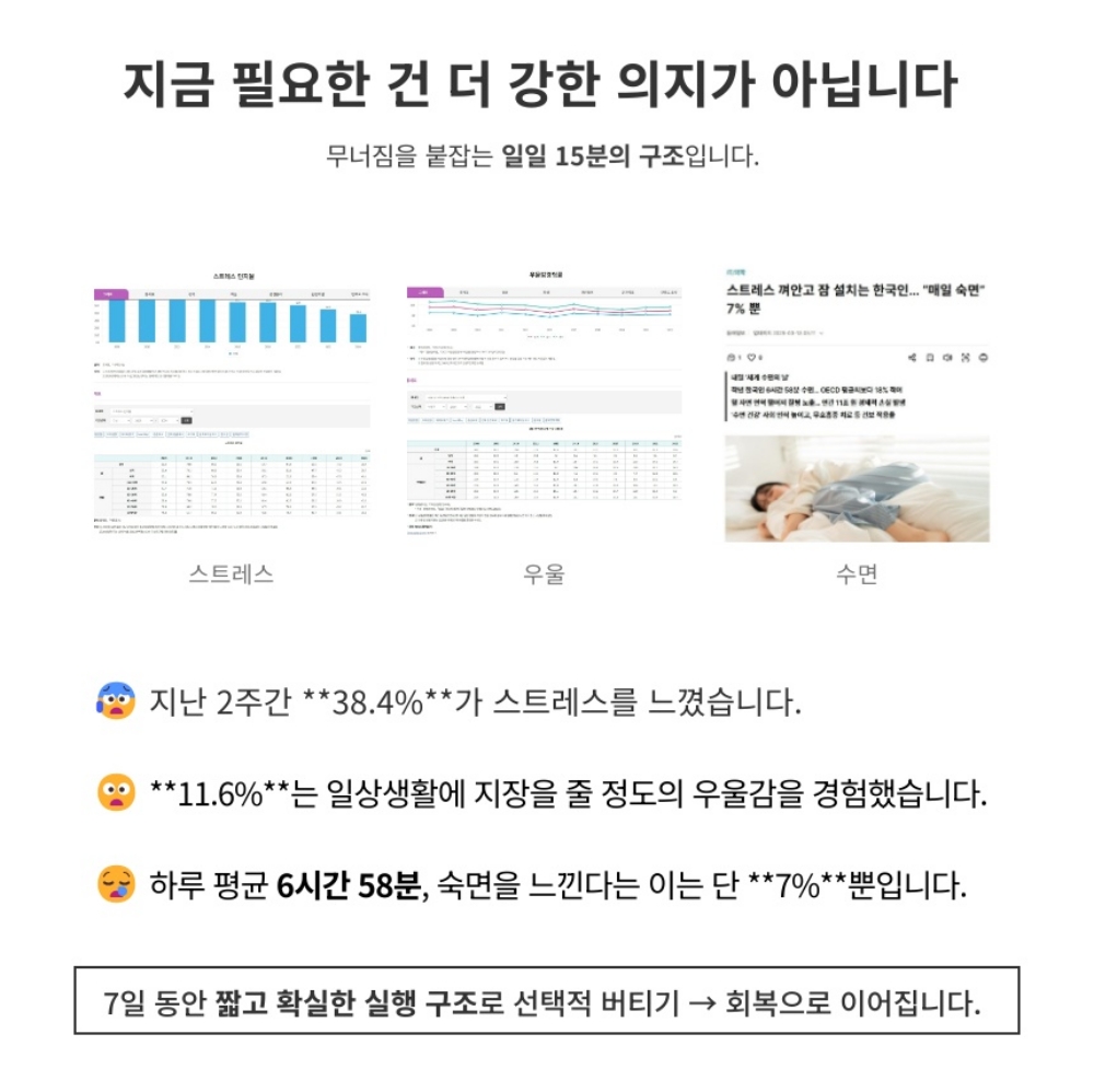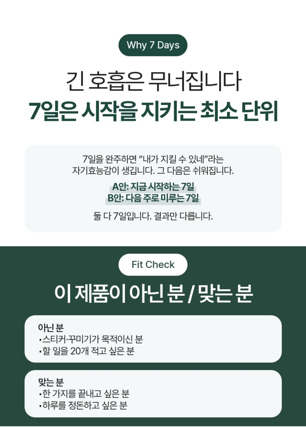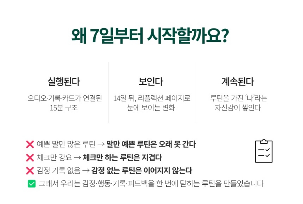 7일/14일 챌린지를 통해 ‘짧게라도 완주 경험’을 주어 자신감 회복 → 장기 루틴 정착 목표.