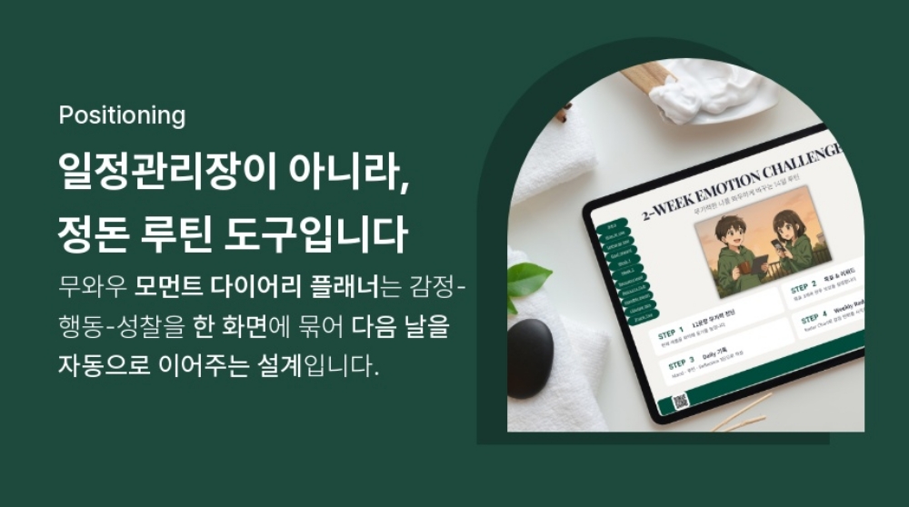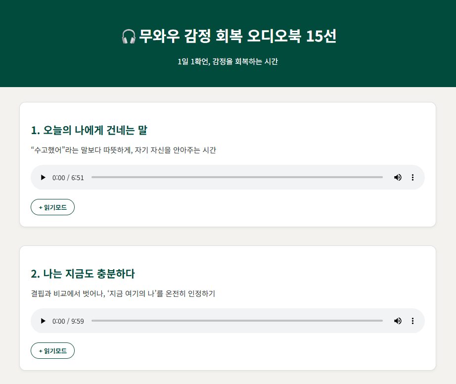 단순 다이어리가 아닌, 오디오 + 플래너 + 감정카드 + 배경화면이 하나로 연결되는 시스템.