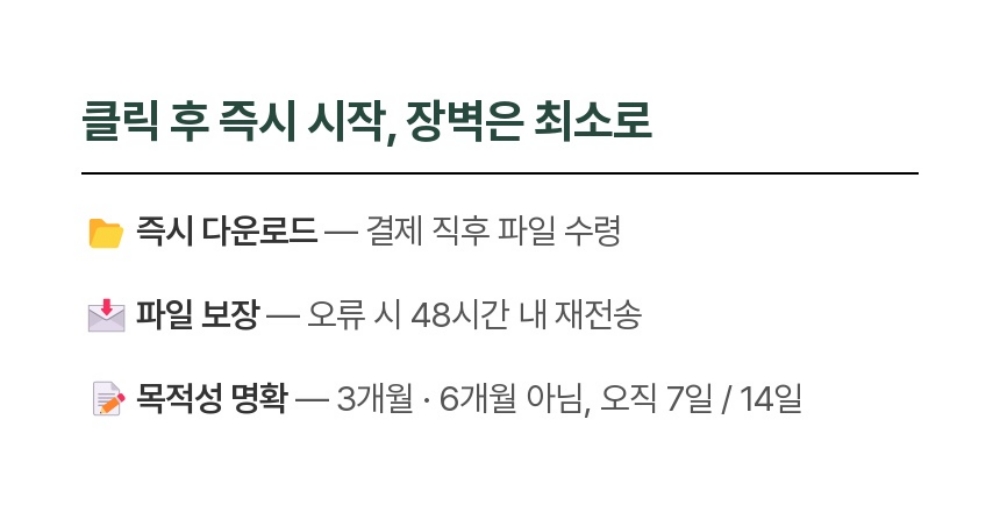 지속 가능한 운영 모델: 무형자산(오디오·PDF·PNG) 중심이라 재고 리스크 없이 빠른 개선/배포