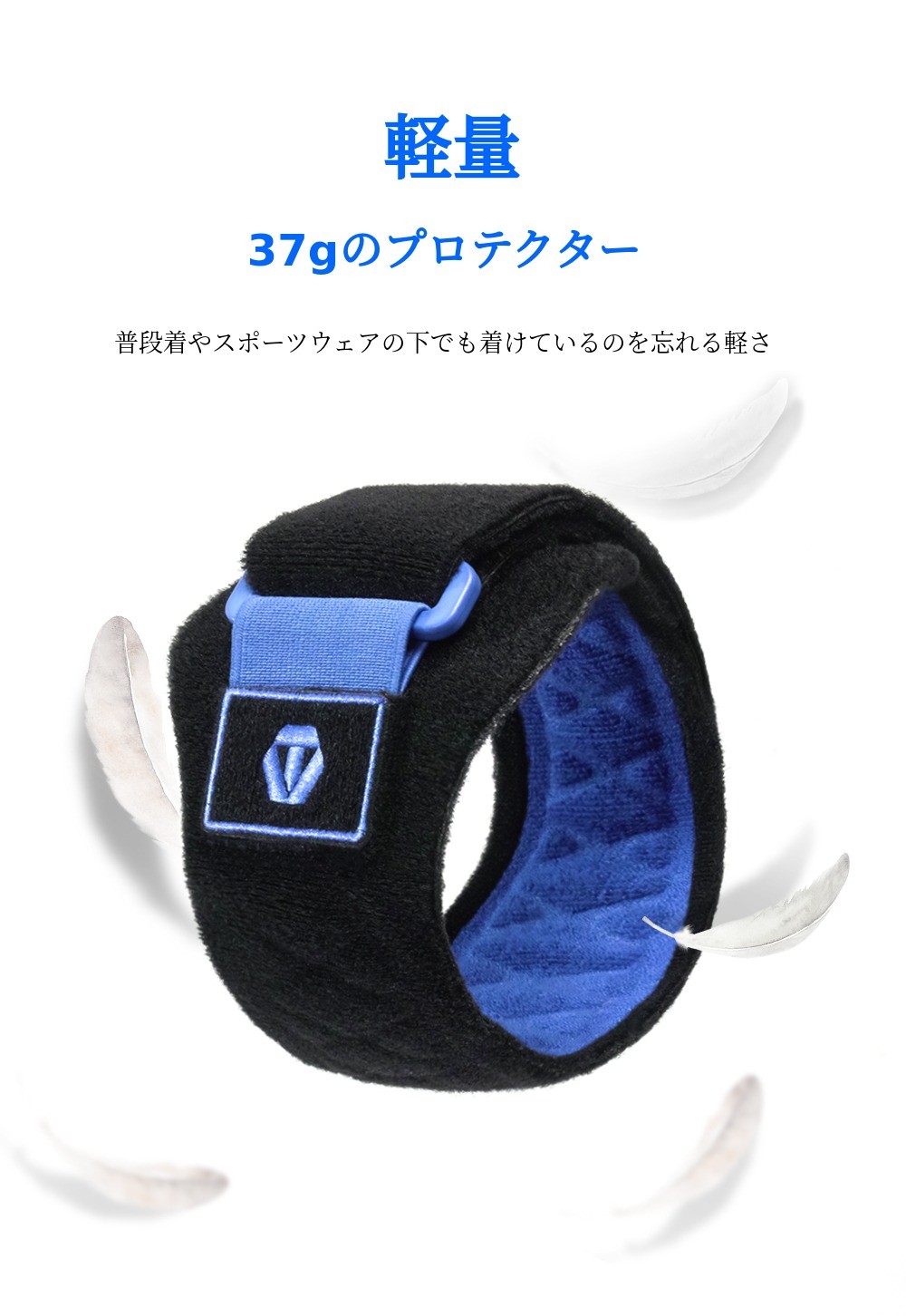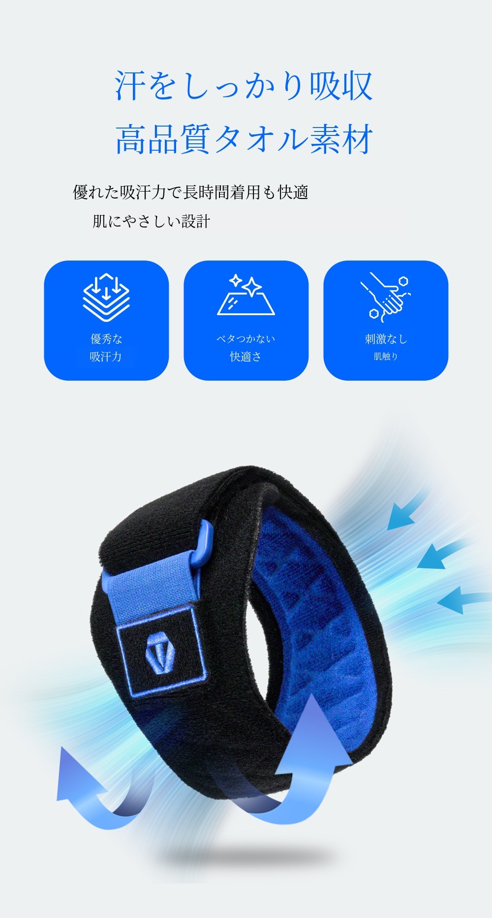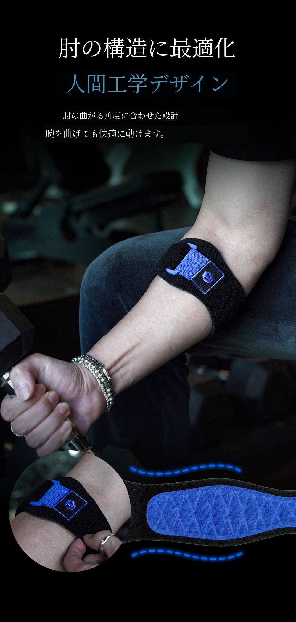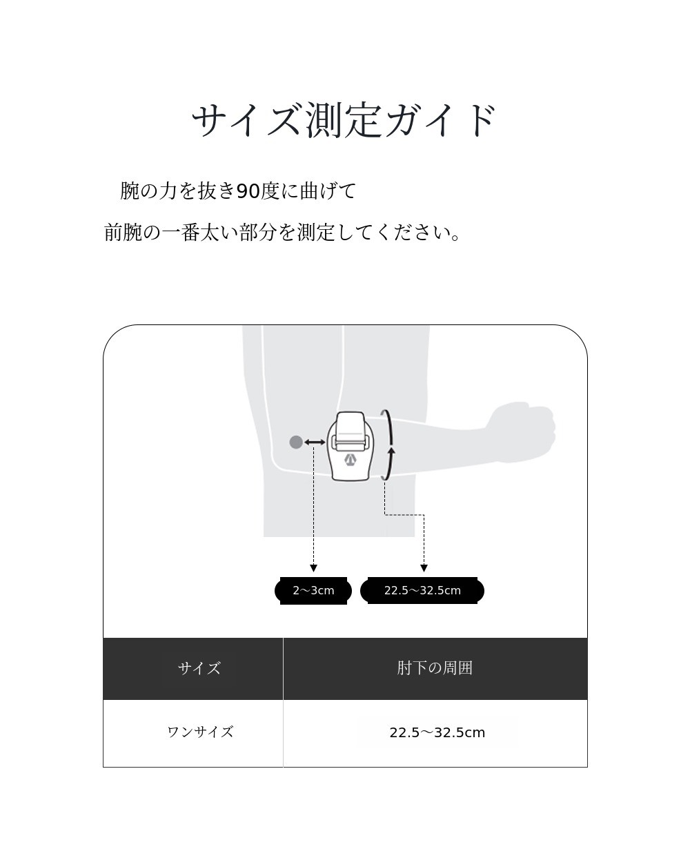 A. 締め付けの強さはベルクロで調整できます。腕を伸ばした状態でフィットする程度に巻いていただくと、曲げてもより快適にご使用いただけます。腕を伸ばした状態で過度に引っ張って着用すると強い圧迫感でかえって不快に感じる場合がありますので、ご案内した締め付け具合で少しずつ調整されることをおすすめします。