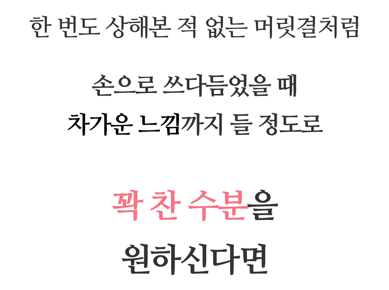 트리트먼트를 사용하고 헹궈내면 모발이 분명 부드러워지기는 해요. 그런데 모발 한 가닥 한 가닥에서 속부터 차오르는 듯한 수분감을 느끼기는 어렵습니다. 원래 건강한 모발은 손으로 쓰다듬었을 때 차가운 느낌까지 들 정도로 수분이 꽉 차 있거든요.