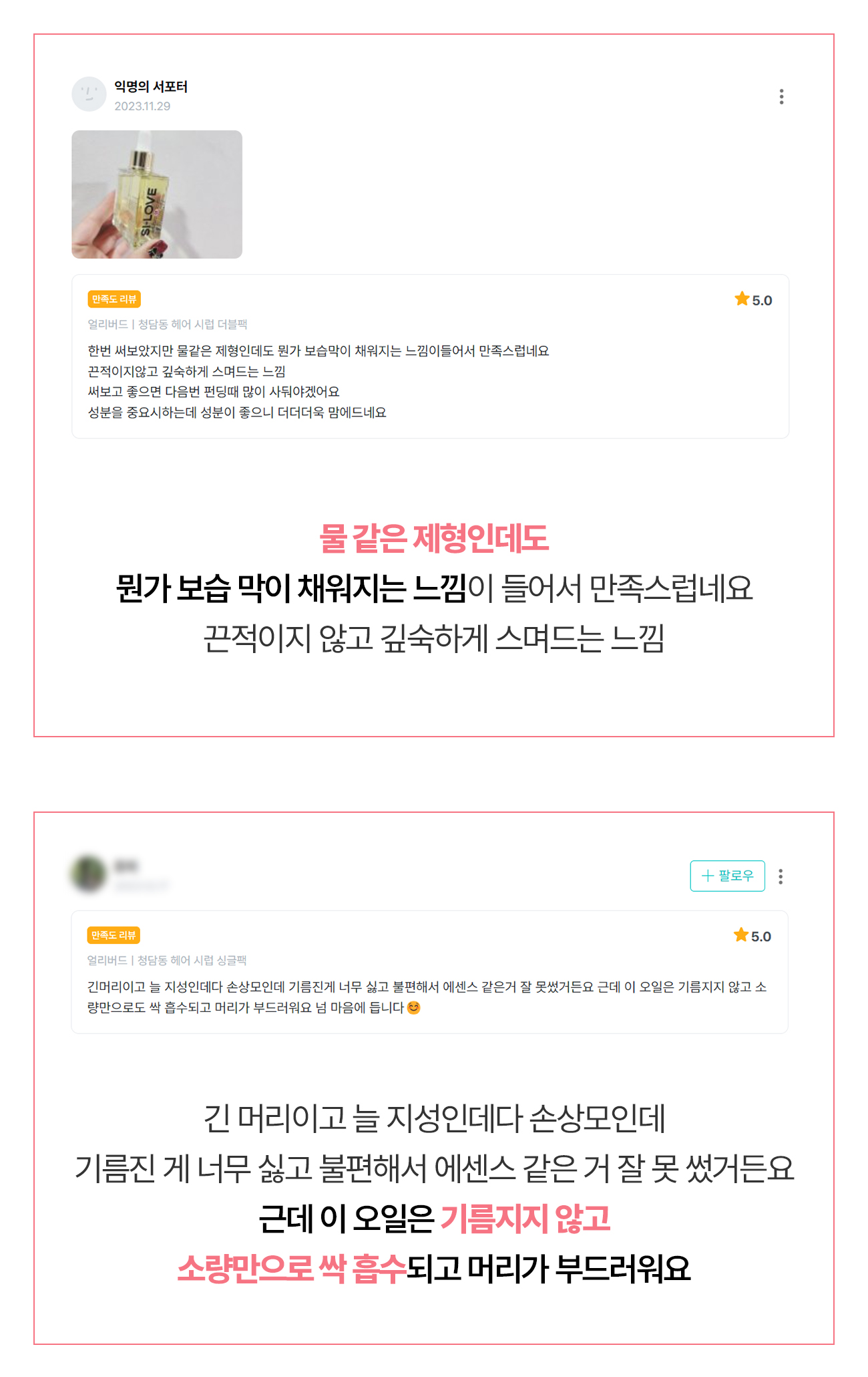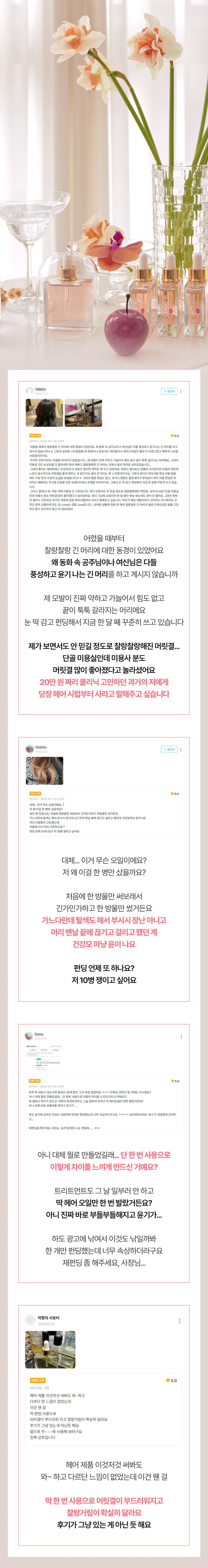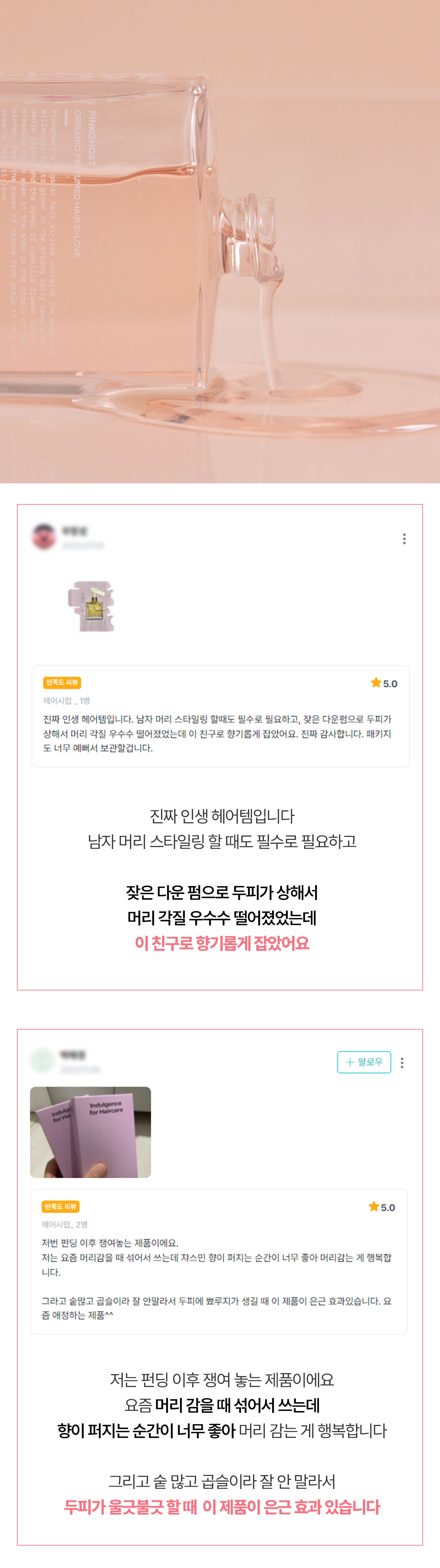아무래도 두피 환경이 식물성 케라틴과 유기농 성분들로 근본적으로 바뀌어서 그런 거겠죠. 실제로 리뷰들 중에서 따로 요청 드린 적도 없는데 두피 개선을 딱 집어 말씀해 주신 분들이 있어서 저희도 놀랐답니다.