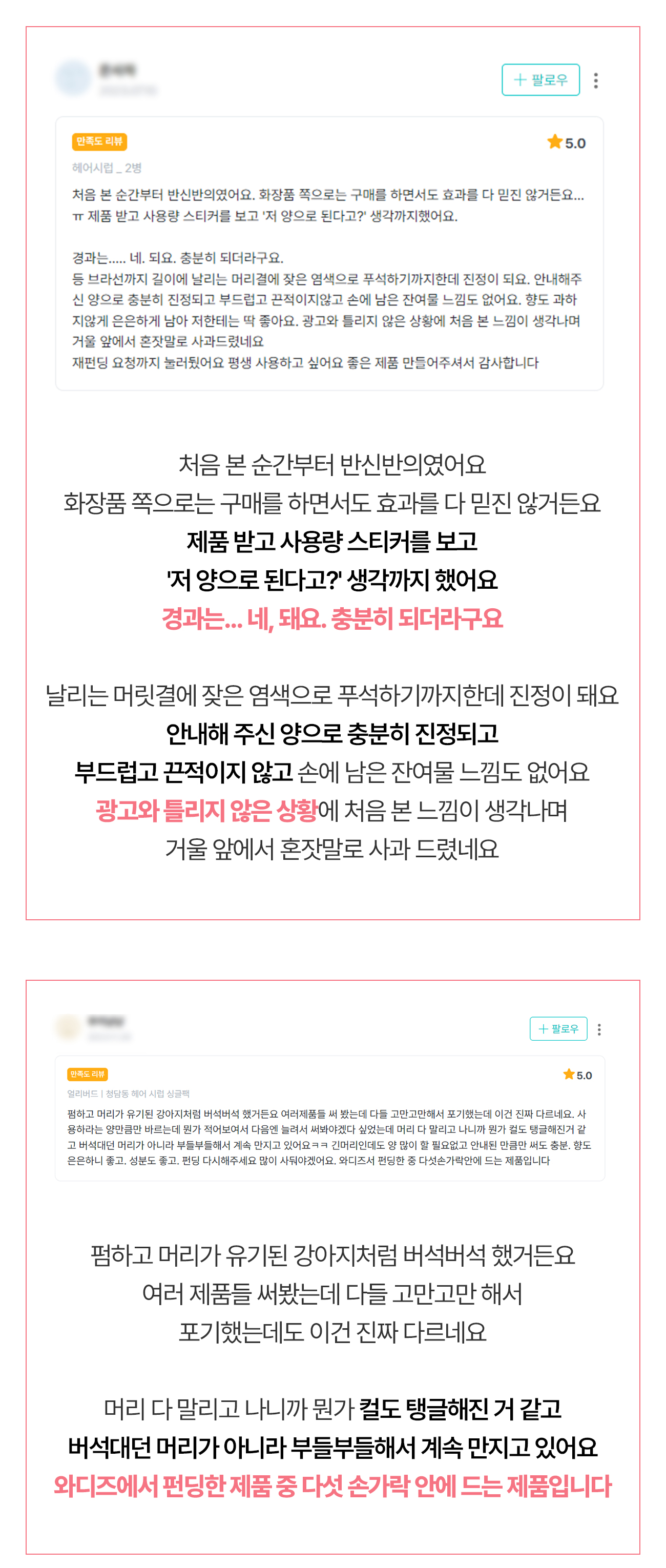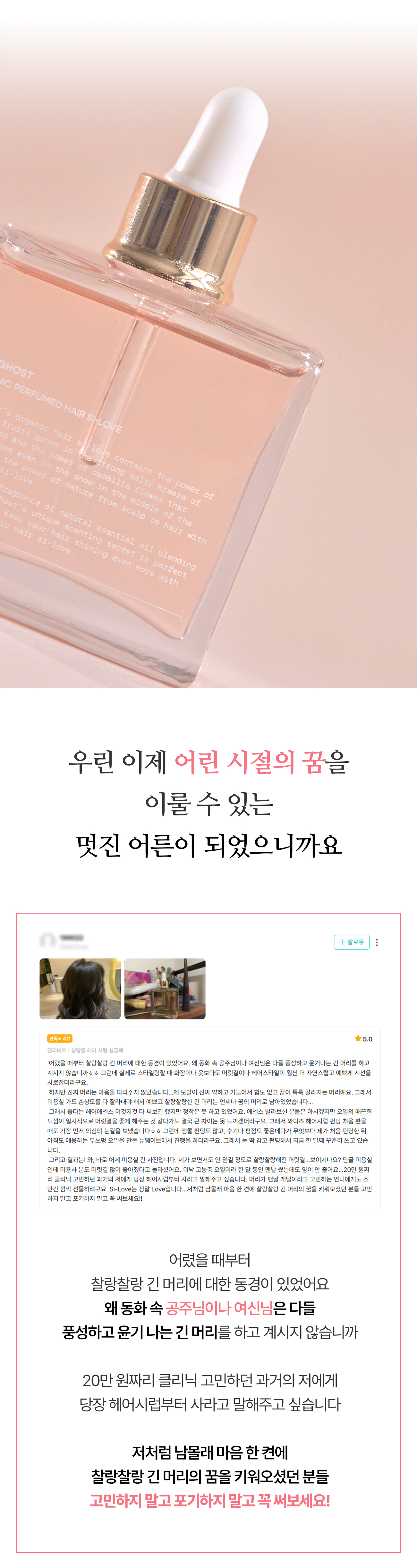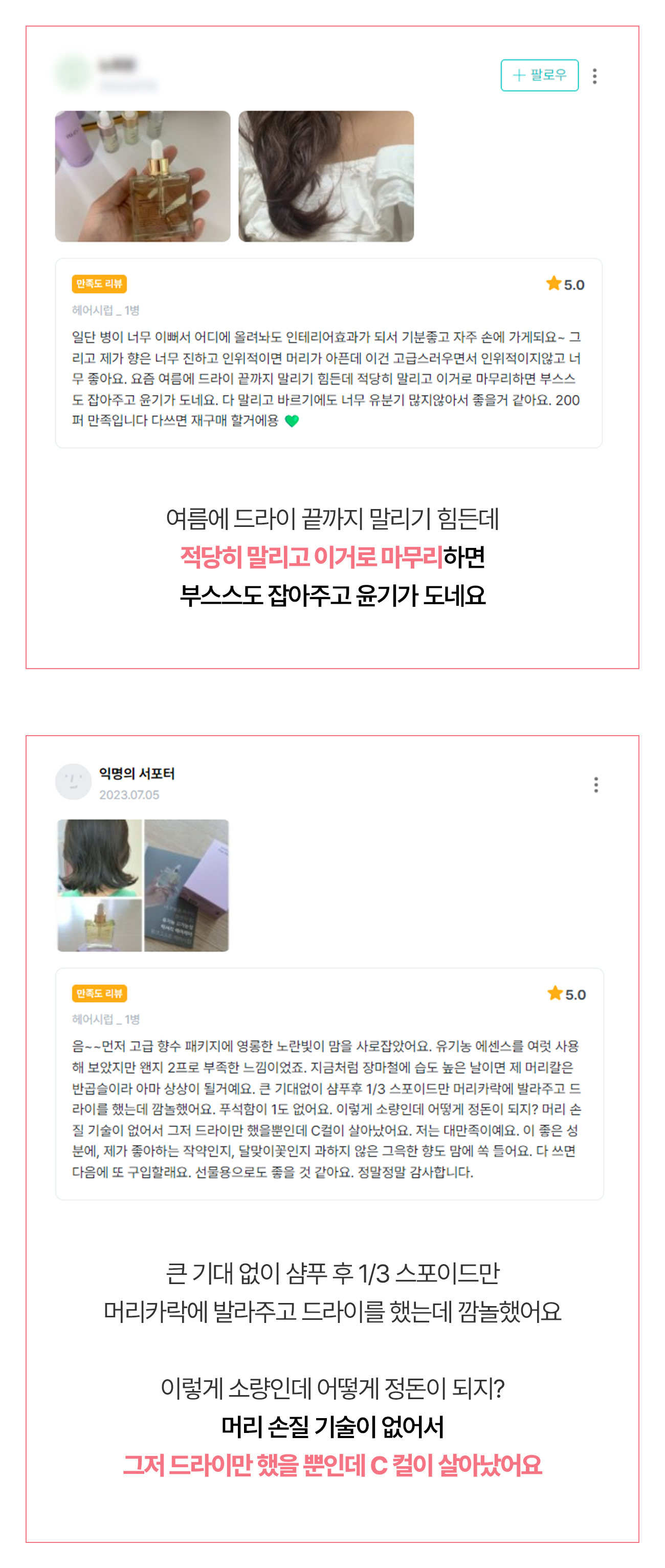 아무래도 두피 환경이 식물성 케라틴과 유기농 성분들로 근본적으로 바뀌어서 그런 거겠죠. 실제로 리뷰들 중에서 따로 요청 드린 적도 없는데 두피 개선을 딱 집어 말씀해 주신 분들이 있어서 저희도 놀랐답니다.