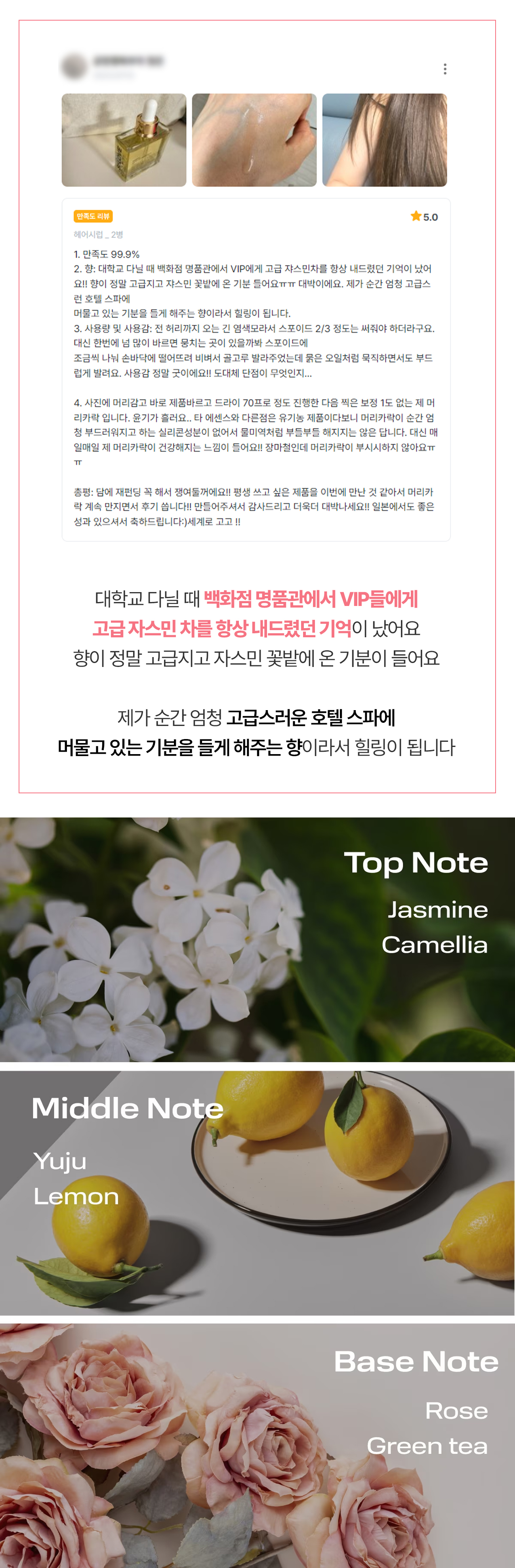 청담동 헤어 시럽의 쟈스민 향은 화이트 자스민에 장미 한 방울을 떨어뜨린 것 같은 향으로, 향수처럼 탑 노트 - 미들 노트 - 베이스 노트로 이어지는 천연 향기가 지나가던 사람들마저 뒤를 돌아보게 만듭니다.