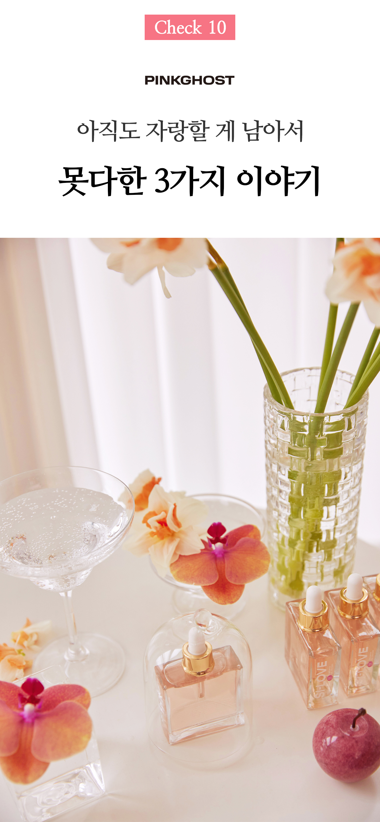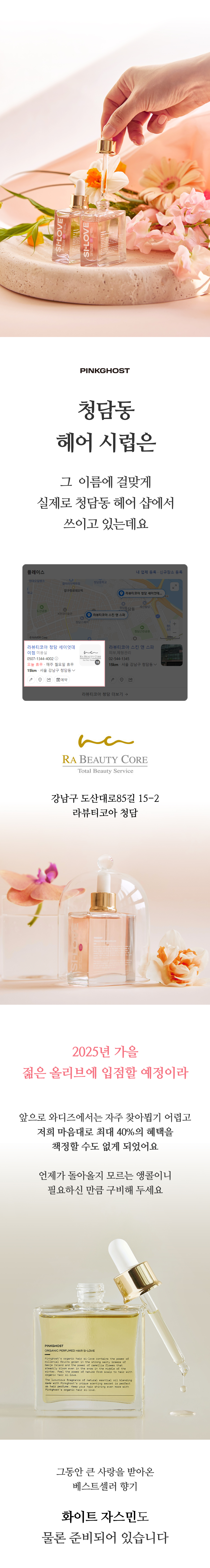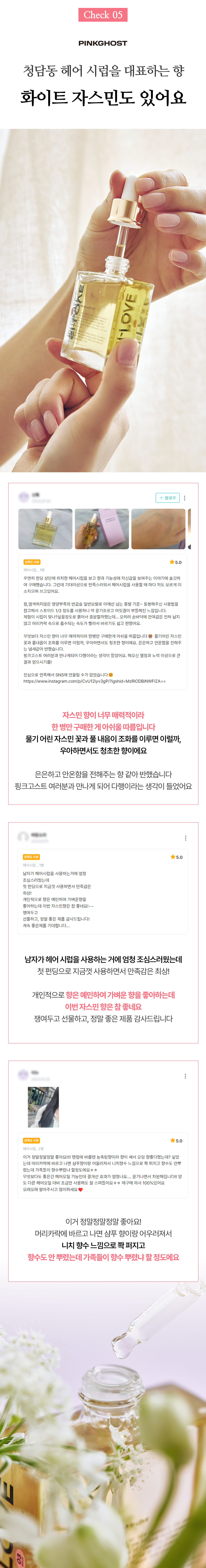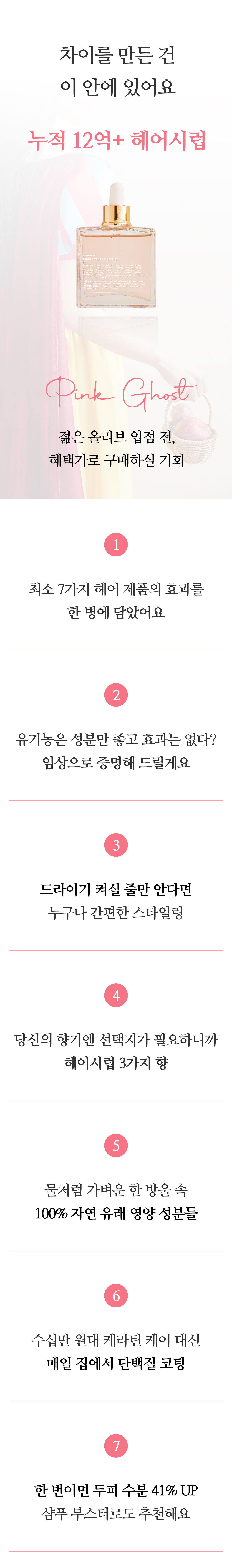 젊은 올리브의 헤어 제품들은 한 번씩 다 써봤다 해도 과언이 아닌데, 그 많은 헤어 케어 제품 중 유기농 전문 브랜드가 하나도 없었습니다. 거제도에서 나고 자라서인지 천연 성분, 유기농이 당연했던 저는 '성분보다 효과가 중요하다'는 인식이 만연한 대한민국 시장에서, '성분도 효과만큼 중요하다'는 걸 증명하려는 오기 하나로 아직도 핑크 고스트를 운영하게 되었고요.
