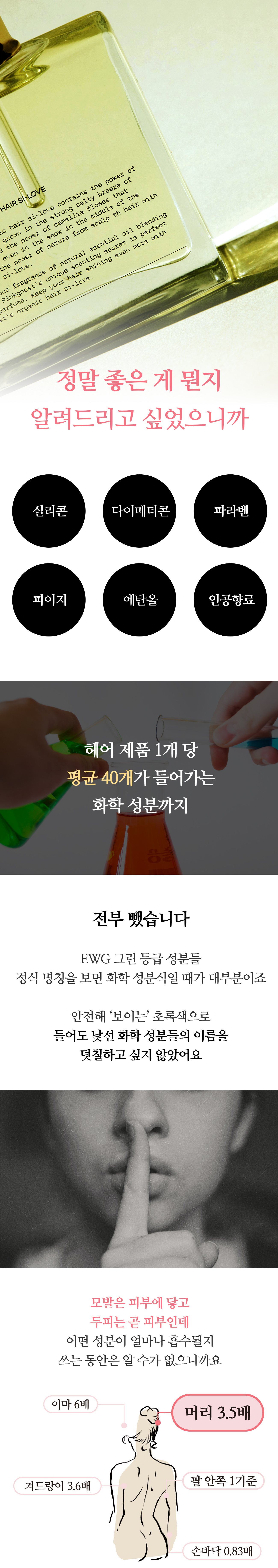 노을진 해변에 파도가 부서지는, 거제도라는 대자연을 앞에 두고 정작 제 긴 머리에 발라주는 온갖 헤어 케어 제품들은 화학 전공자도 한번에 읽기 어려운 화학 성분들로 가득한 게 너무 싫었어요. 원래 머리 숱이 많고 굵은데다 길어서 스킨 케어보다 헤어 케어에 먼저 눈을 떴거든요.