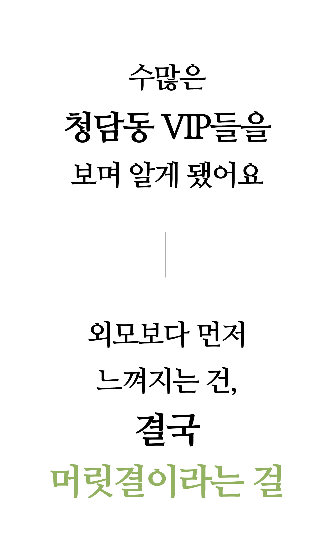 그간 피부에 바르는 것만 성분을 신경 쓰셨다면, 청담동 헤어 시럽을 개봉하시는 순간부터는 모발과 두피에 바르는 것까지 하나 하나 성분을 챙겨 보세요. 청담동 VVIP들에게는 일상인 루틴이니까요.