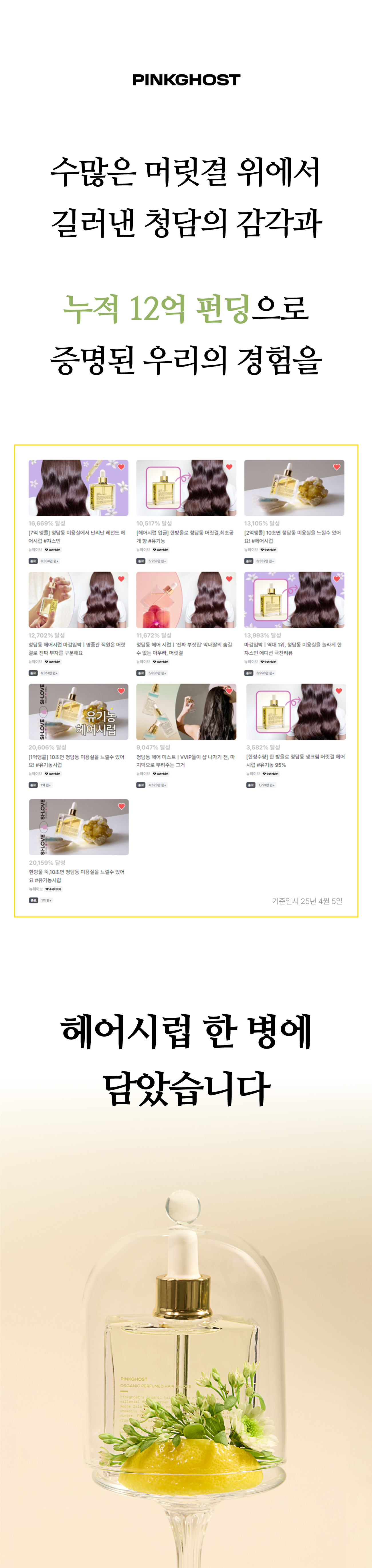 유기농 헤어 시럽으로 와디즈 헤어오일 1위의 왕좌에서 내려온 적 없는 핑크 고스트라면 깰 수 있으니까요. 그간 생산비에 허덕이느라 인체적용시험으로 헤어 시럽의 가치를 증명하지 못했는데, 예정된 젊은 올리브 입점을 준비하며 큰 마음 먹고 '숫자'로 저희를 증명하기로 했어요.