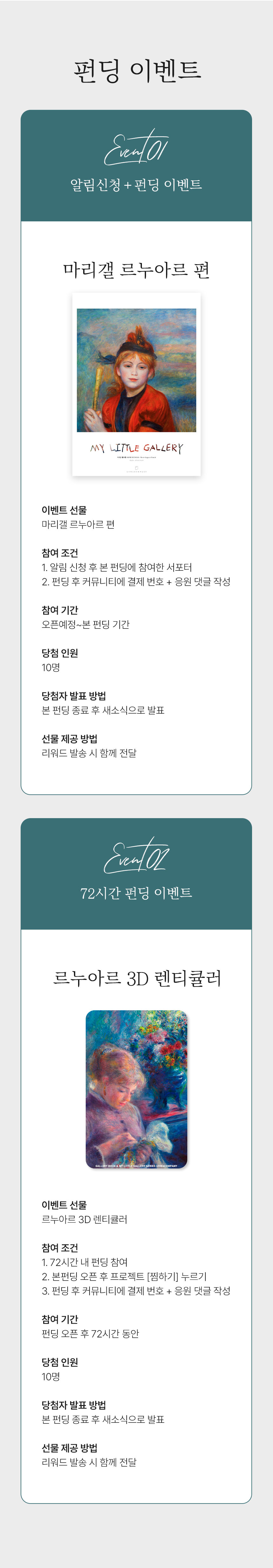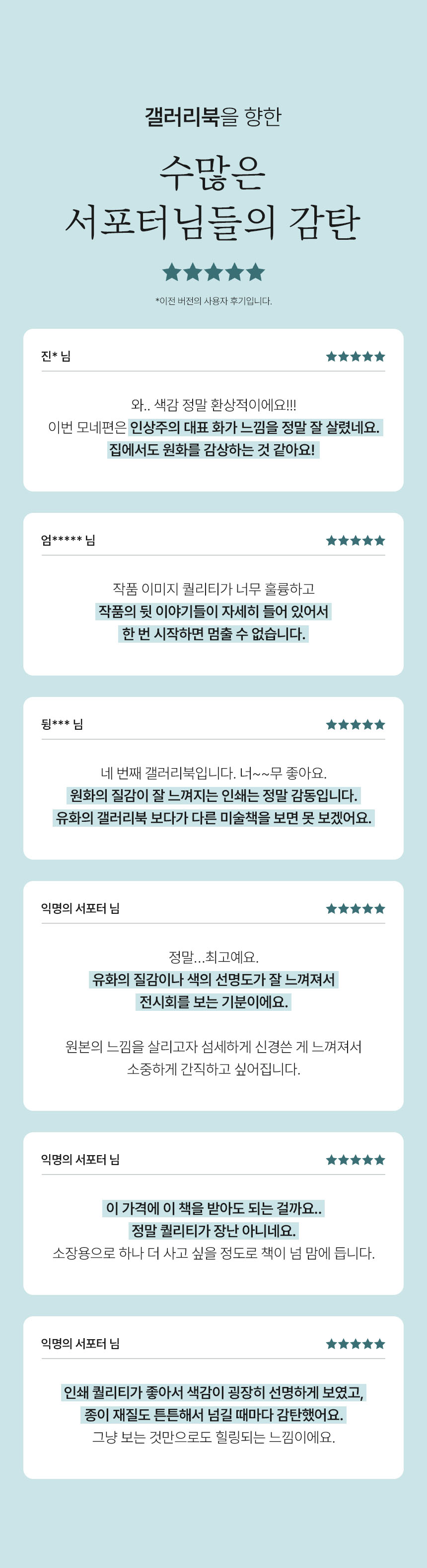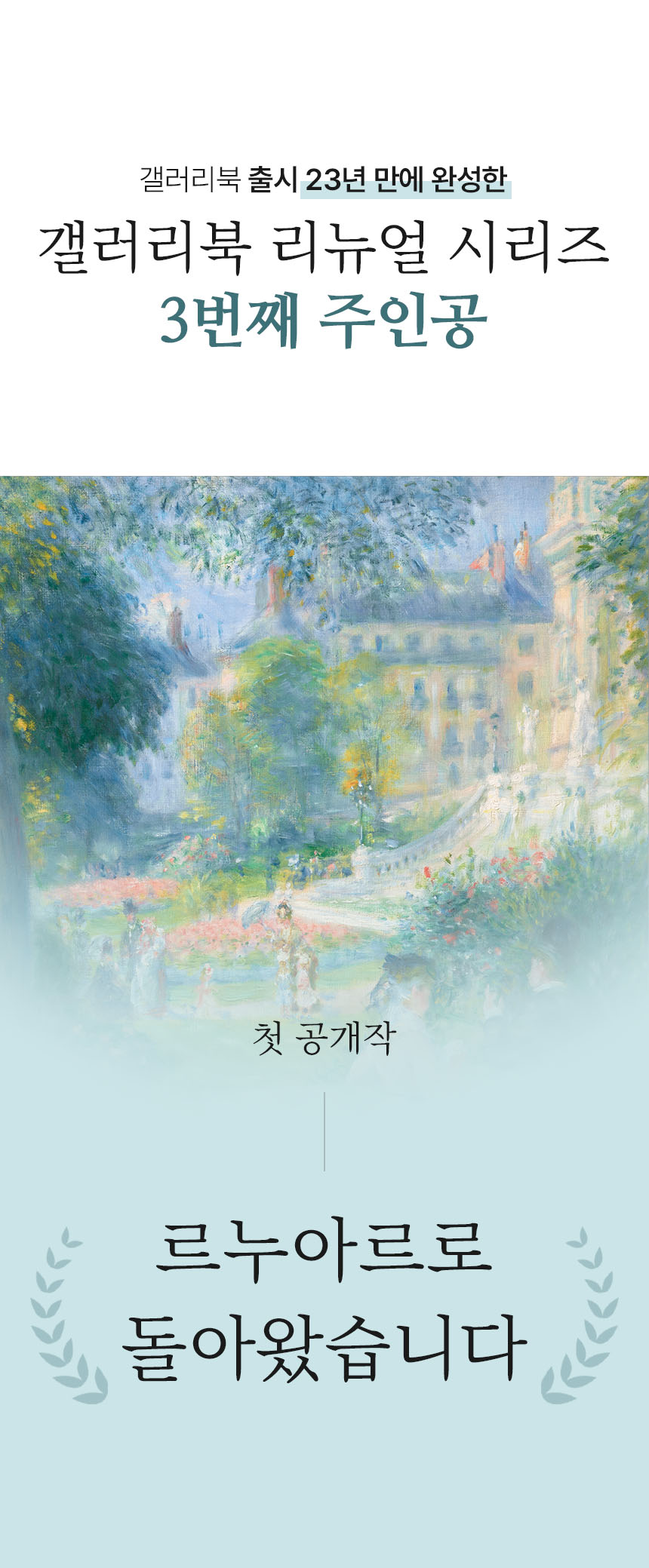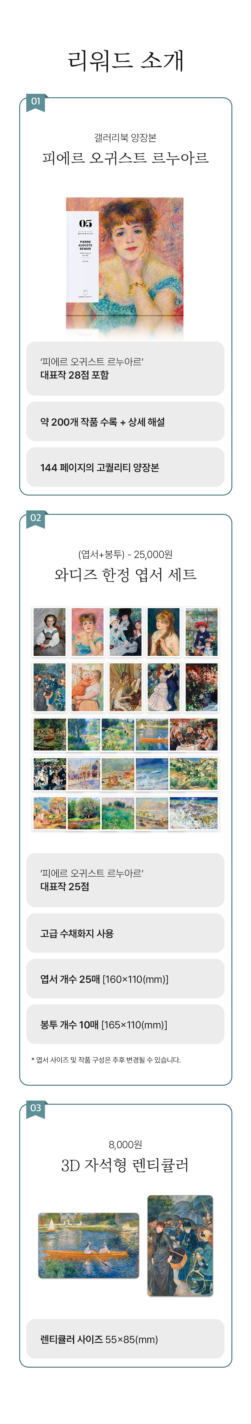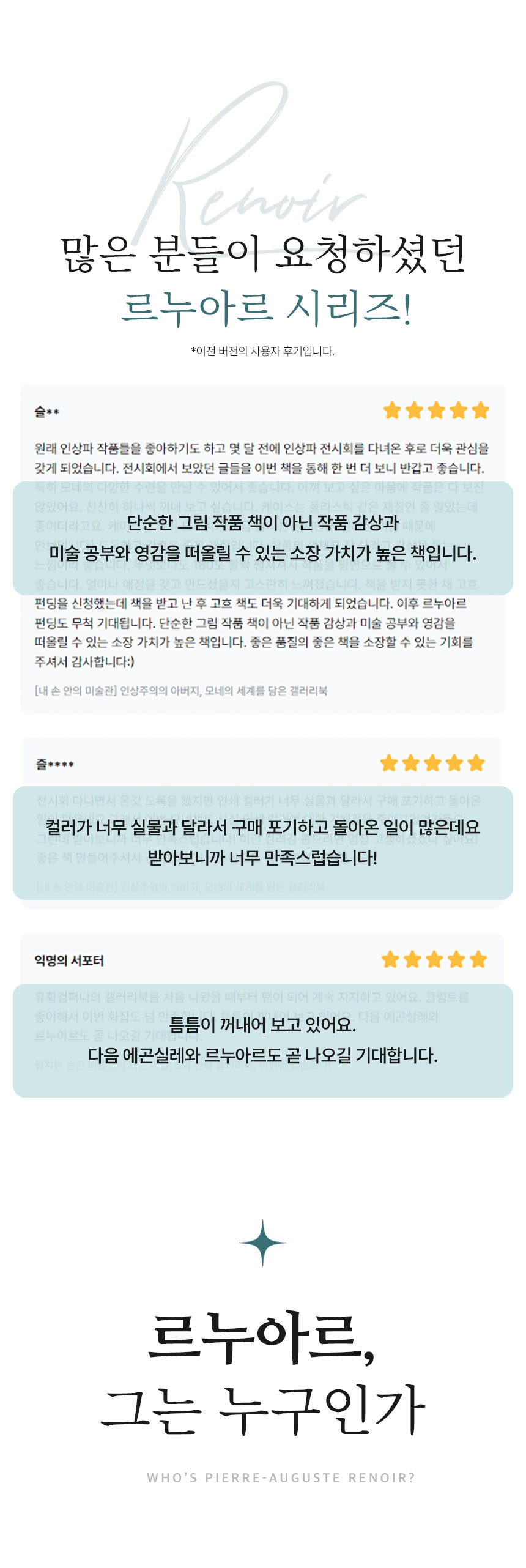 와디즈 서포터 여러분의 도움으로 갤러리북 시리즈 1 개발의 꿈을 이룰 수 있었고, 이후 출판을 통해 많은 분들이 명화의 진정한 아름다움을 알게 되었다는 후기를 보며 행복했습니다. 지금도 제 마음에 깊이 남아있는 리뷰가 있습니다. 바로 "시리즈가 멈추지 않고 계속 나왔으면 좋겠어요."입니다.