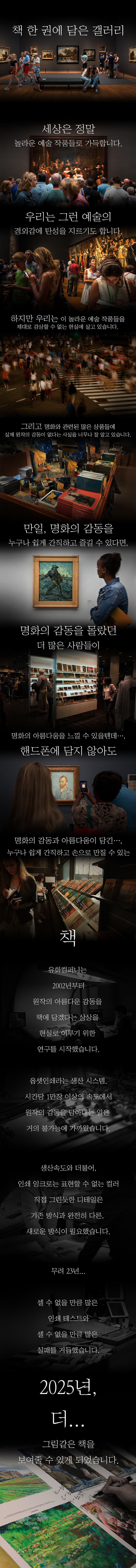 물론 비싼 가격에 소장가치가 높은 책을 만드는 것도 가능했지만, 그건 우리가 오랫동안 꿈꿔온 목표와는 달랐습니다. 우리 세대가 쉽게 접하지 못했던 명화의 아름다움을 다음 세대에게 선물하고 싶었기 때문입니다. 비싸서 소수만 즐기는 것이 아닌, 누구나 편하게 볼 수 있는 가격으로 말이죠.