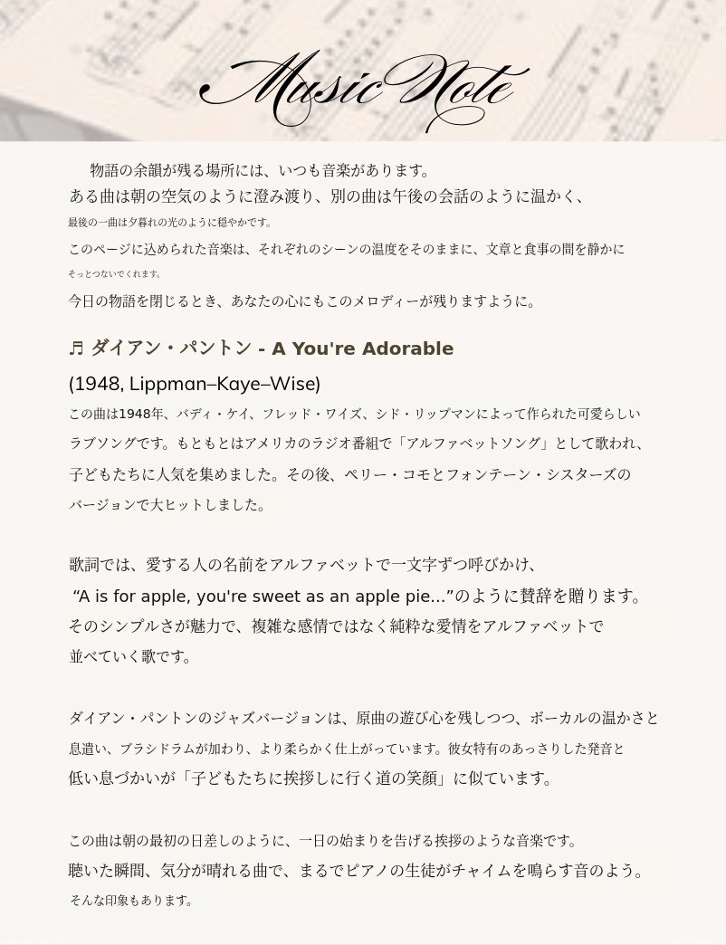ページをめくりながら、またはブランチを楽しみながら聴くと、まるで一本の映画の中に入ったように物語と音楽が自然につながります。