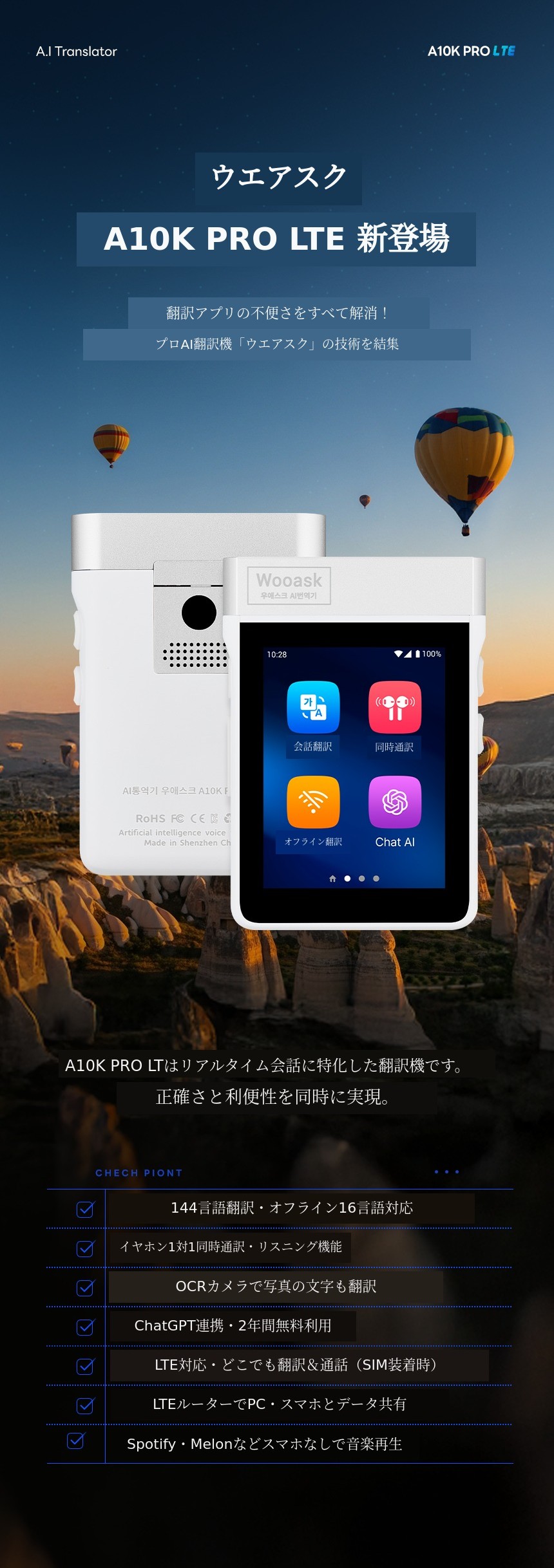ChatGPT搭載のLTE AIリアルタイム通訳機「ウエスク A10K PRO」発売