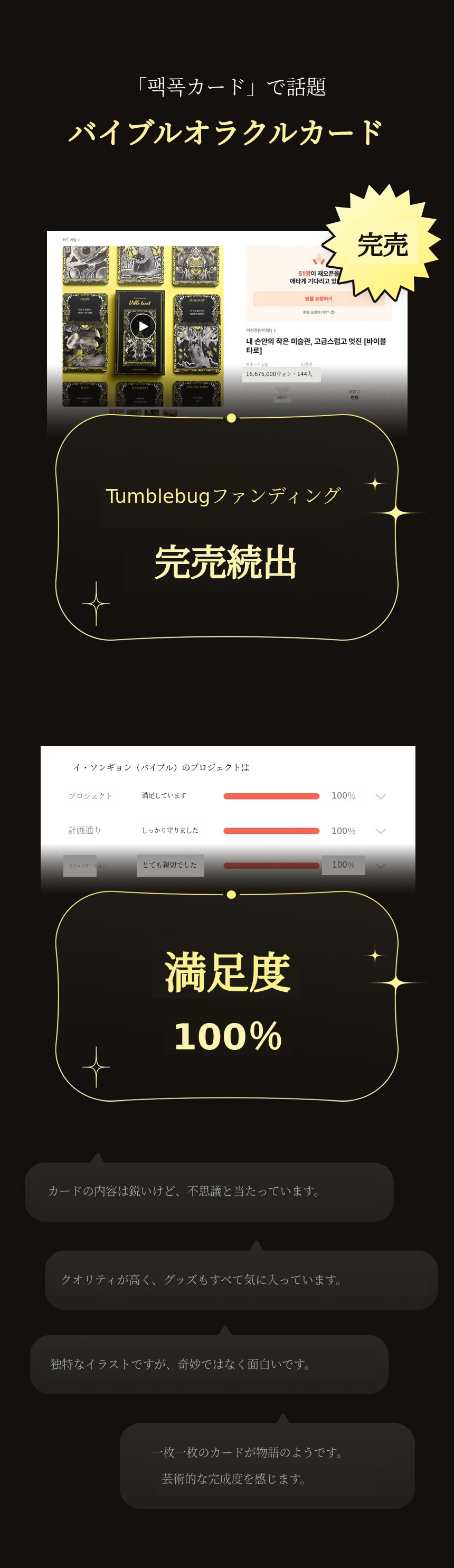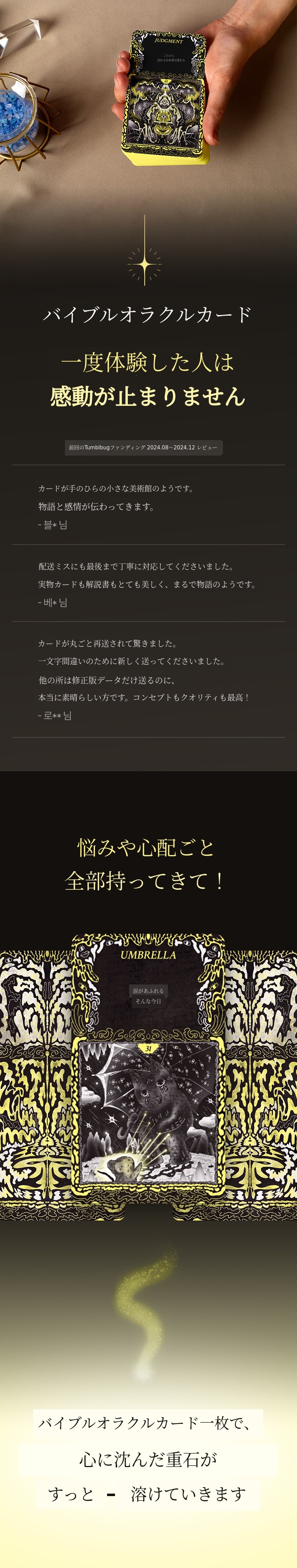今回のWadizファンディングは、これまでの研究と記録を公式製品化する最初の旅です。このプロジェクトを通じてデザインとアート、スピリチュアリティをつなぐ新しい感情アートブランドへと進みたいと考えています。バイブルオラクルは誰かにとっては単なるカードですが、私にとってはサバイバル記であり復活の記録です。皆さんが辛い瞬間、「大丈夫、まだ生きているじゃない」と語りかけるこのカード一枚が力になれば幸いです。