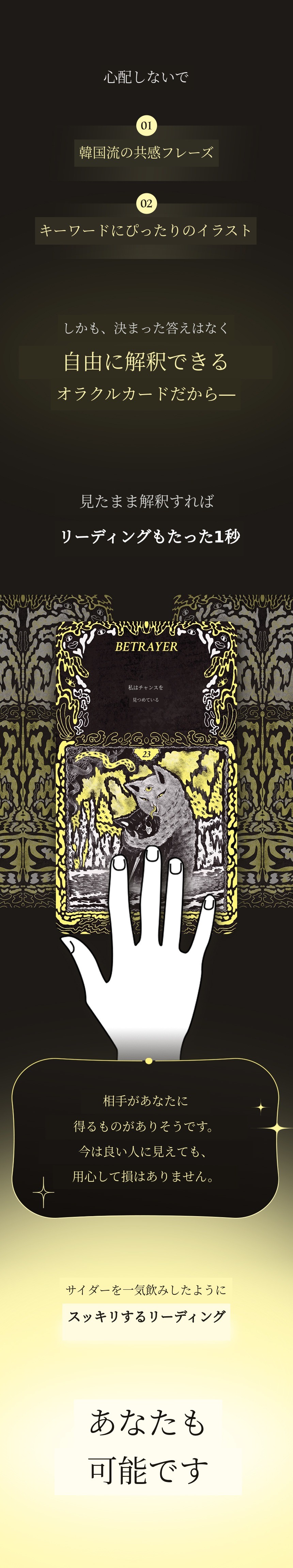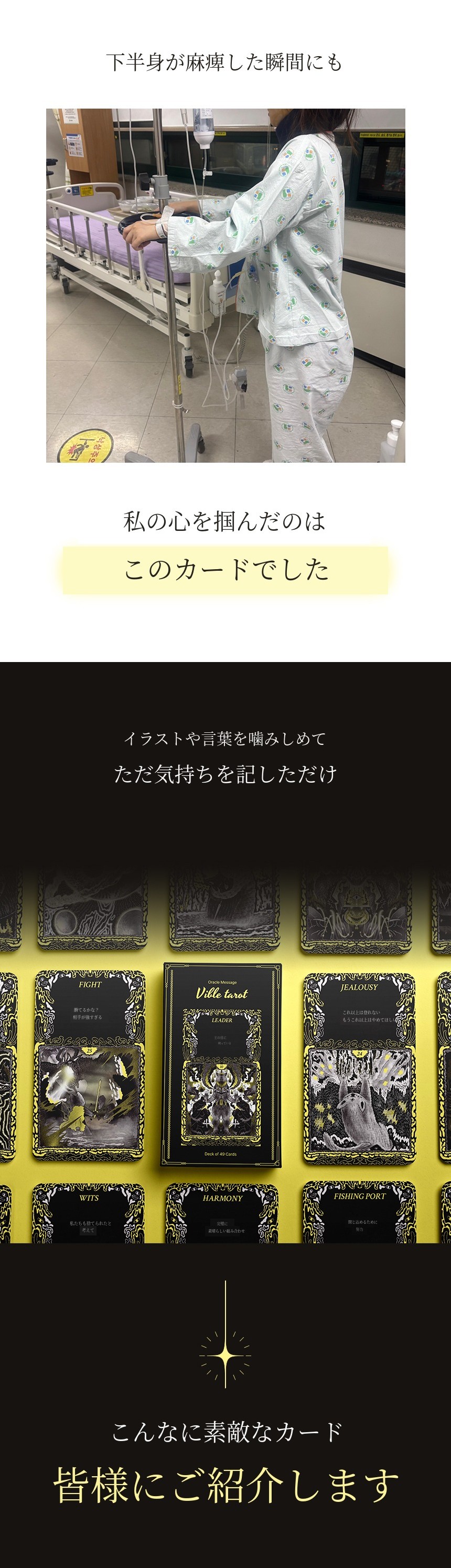 このカードは脊椎手術後に下半身が麻痺した私の精神を支えてくれた奇跡のような道具です。歩くことはもちろん、座って絵を描くことさえ難しかったその時間の中で「このカードの文章とイメージ」を見ながら耐えました。その時気づきました。これは予言の道具ではなく、「生きていることを証明する言語」だということを。今も改訂版を作りながら当時の傷と再び向き合っていますが、今回も逃げずに耐えています。