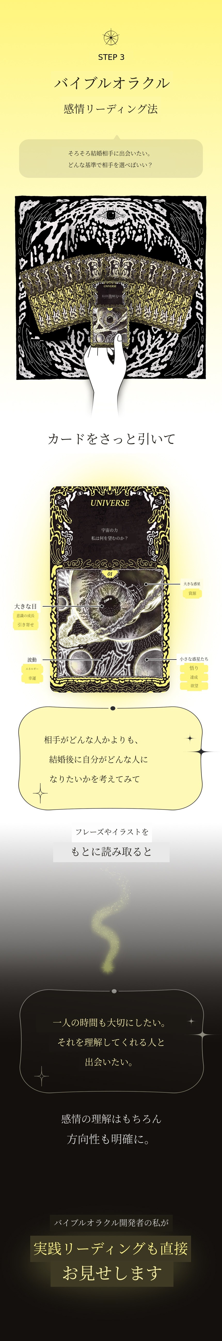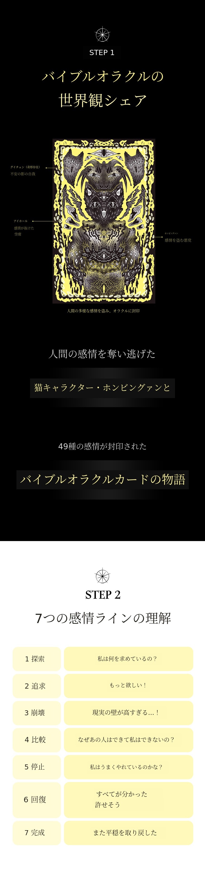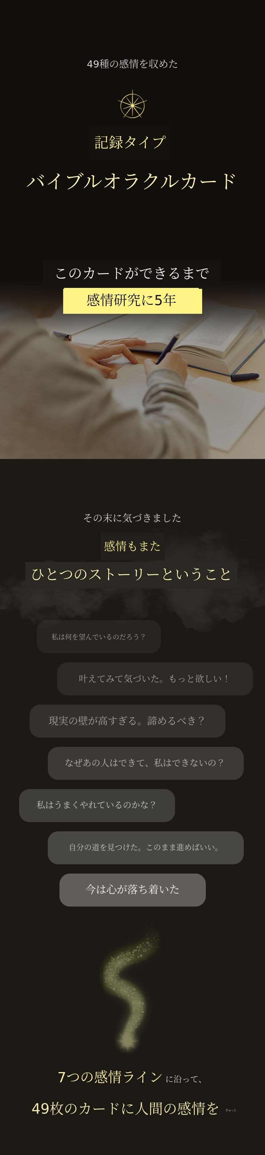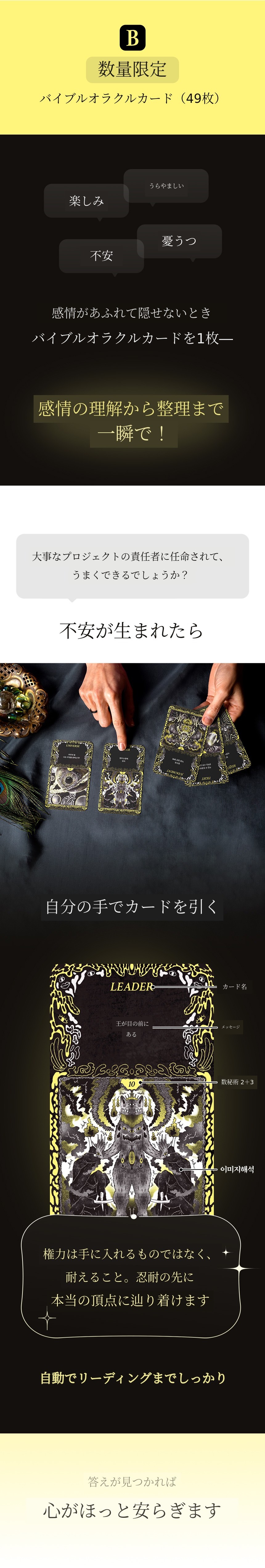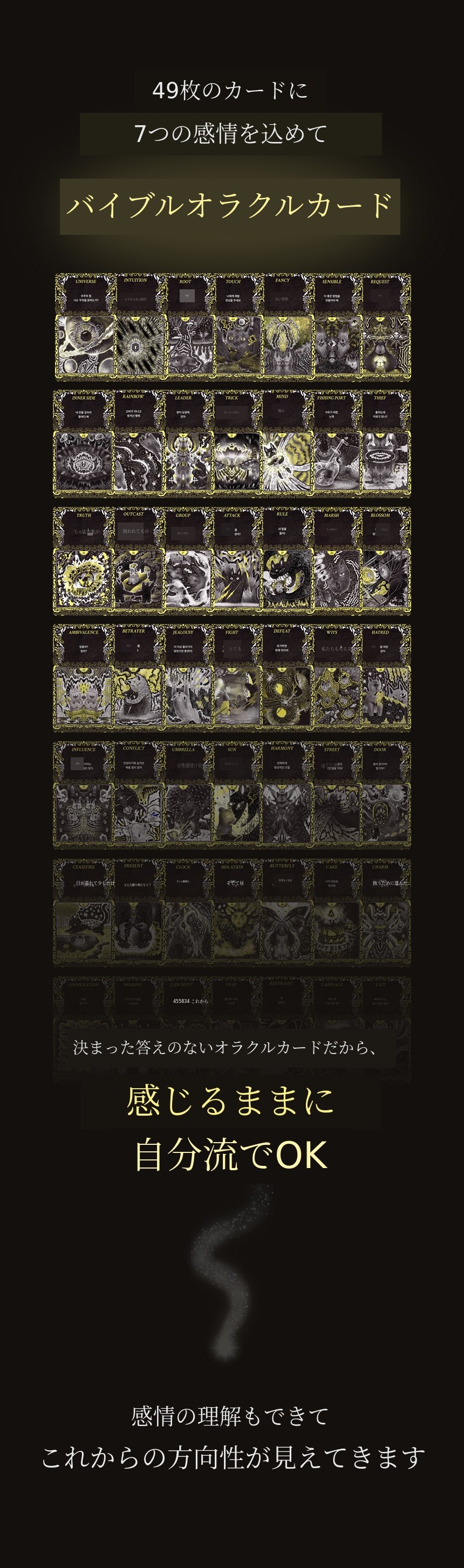 本来UXデザイナーとしてユーザーの感情と行動を観察し、「不安を減らし安心を設計するデザイン」を研究してきました。人の心が「どのように揺れ、回復するか」をデータのように分析した結果をオラクルカード49枚に込めました。「感情・デザイン・スピリチュアリティ」をすべて網羅するバイブルオラクル、人が自ら感情を回復するための感情設計書です。「不安・怒り・孤立・嫉妬・罠」を経て「回復・安心・光・太陽」へと進む人生の感情地図を目指して作りました。