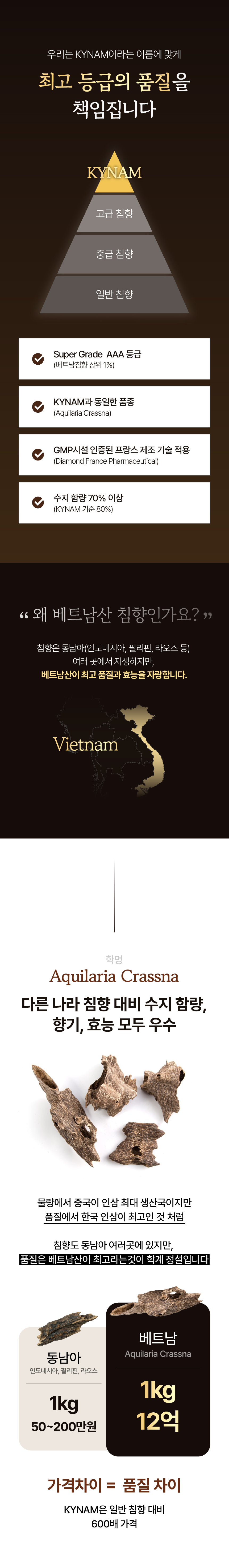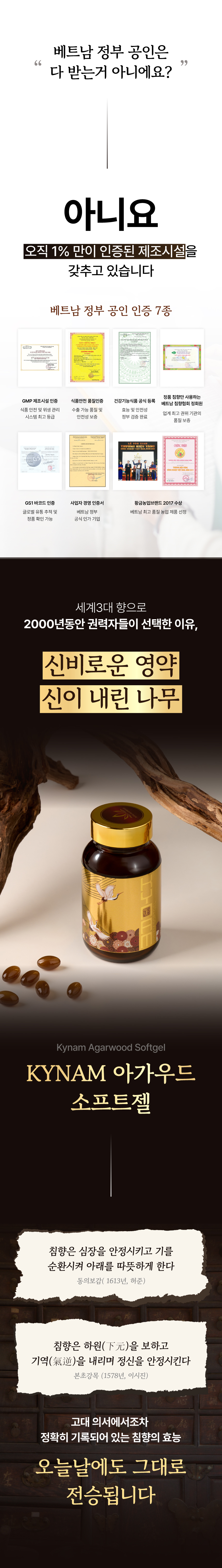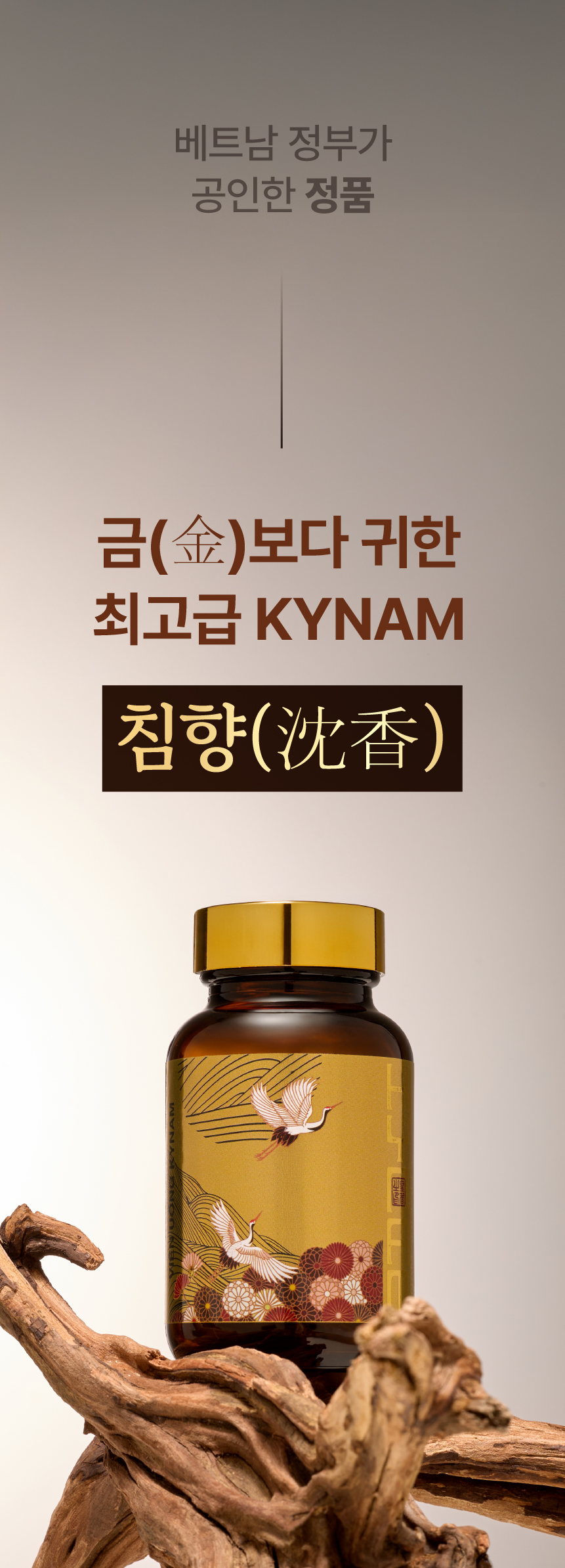 - Kynam 침향은 수지 함량의 순도가 높은 최고급 침향입니다. 또한 프랑스 소프트젤 코팅 기술로 체내 흡수율이 90% 이상입니다. 따라서 일반 환 대비 적은 양으로도 높은 효과를 기대할 수 있습니다.