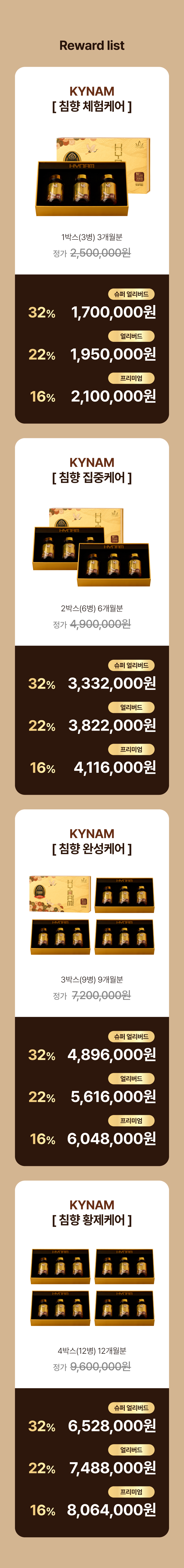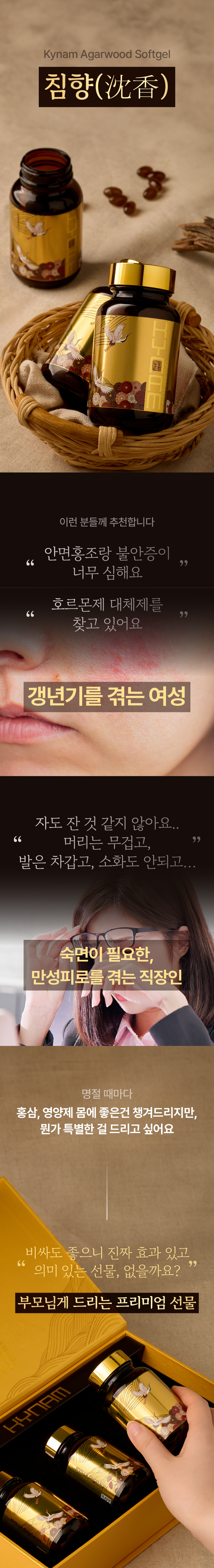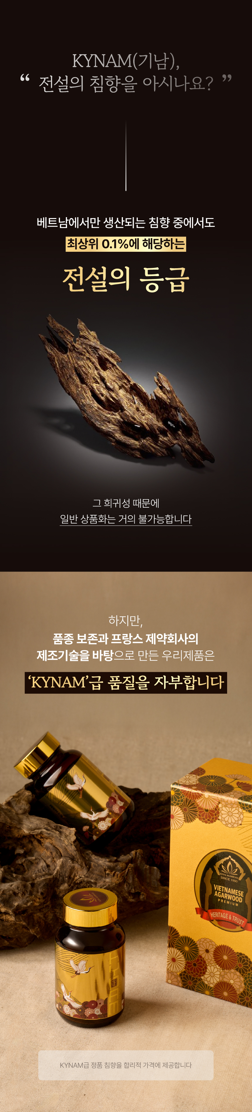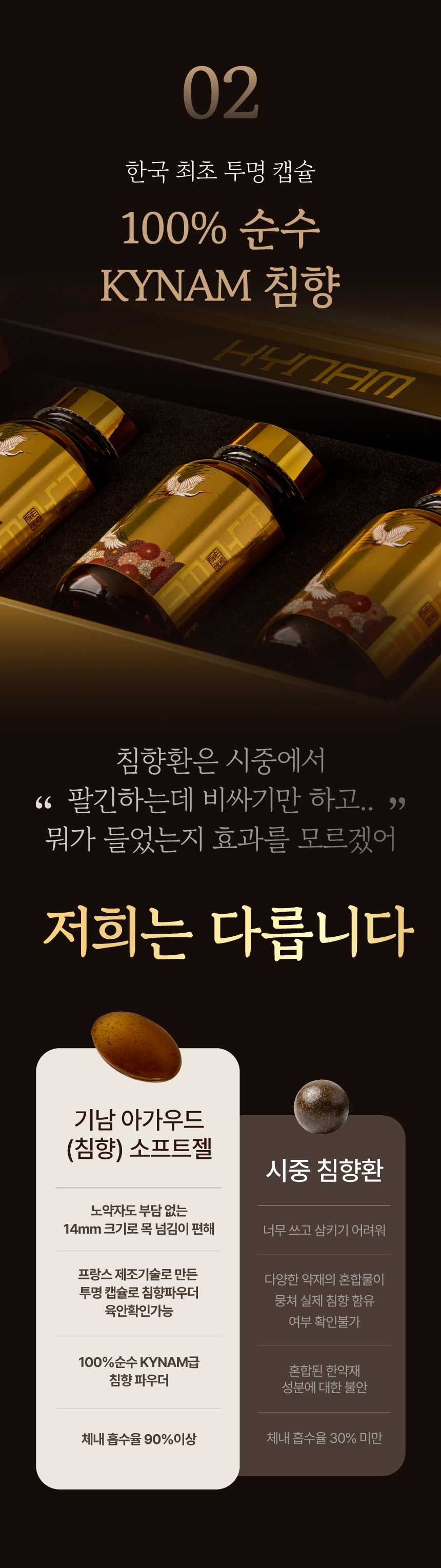 - Kynam 침향은 수지 함량의 순도가 높은 최고급 침향입니다. 또한 프랑스 소프트젤 코팅 기술로 체내 흡수율이 90% 이상입니다. 따라서 일반 환 대비 적은 양으로도 높은 효과를 기대할 수 있습니다.