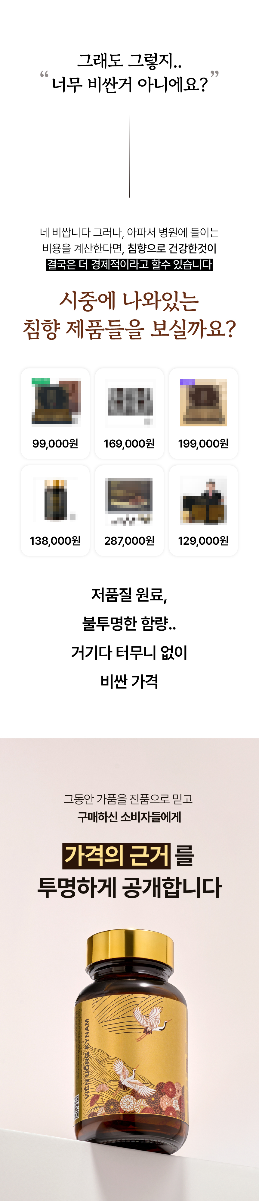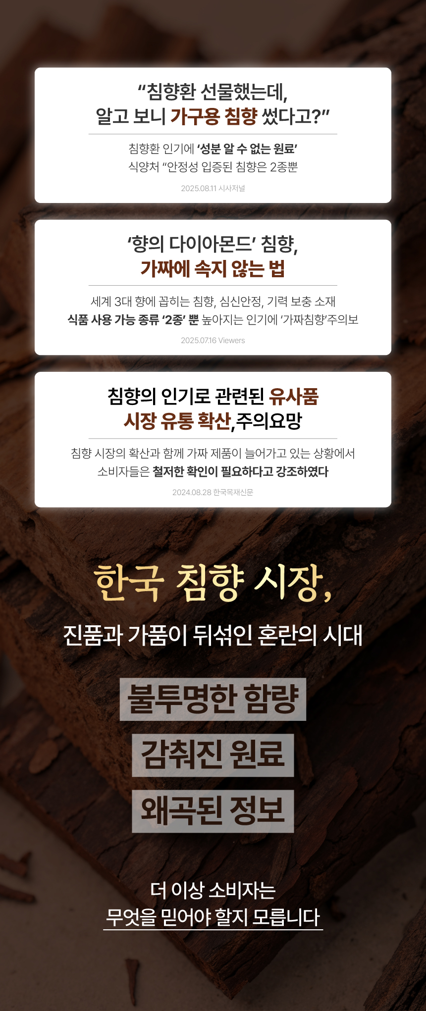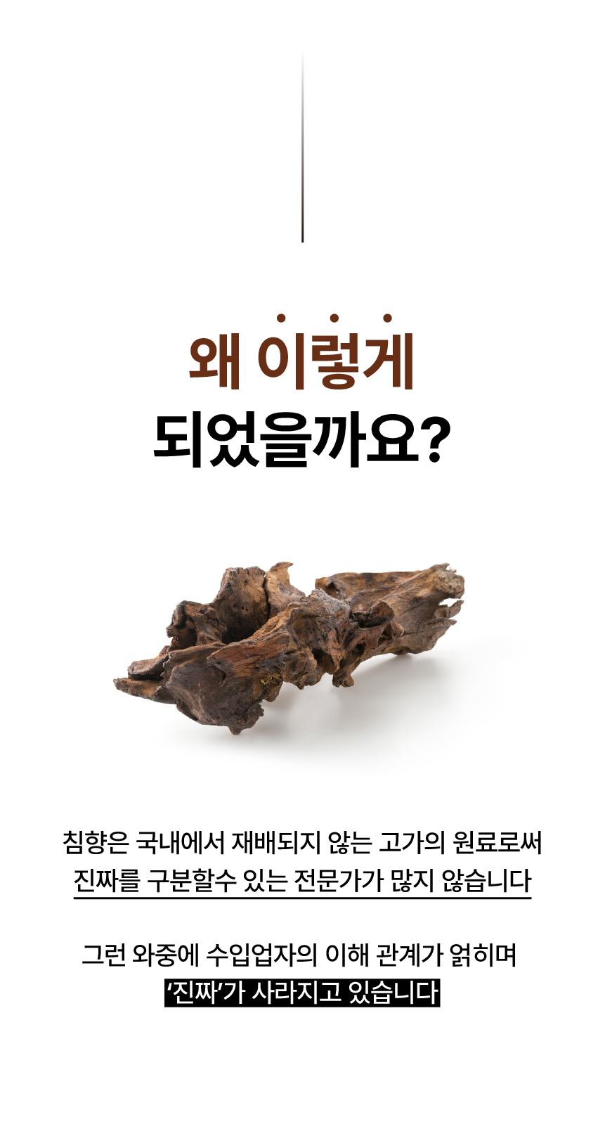 정품 침향의 진정한 가치를 알리기 위해서입니다. 일반 유통망에선 불가피한 중간 마진으로 인해 프리미엄 제품이 프리미엄 가격에만 머무릅니다. 하지만 와디즈에서는 직거래의 투명성으로 최대 32%의 합리적 가격을 실현할 수 있습니다. 무엇보다 여러분이 우리 첫 서포터이자 성장 파트너가 되어주길 원합니다. 피드백과 함께 제품을 개선하고, 모든 약속을 투명하게 지켜내는 과정 속에서 신뢰라는 가장 강력한 자산을 함께 만들어가고 싶습니다.