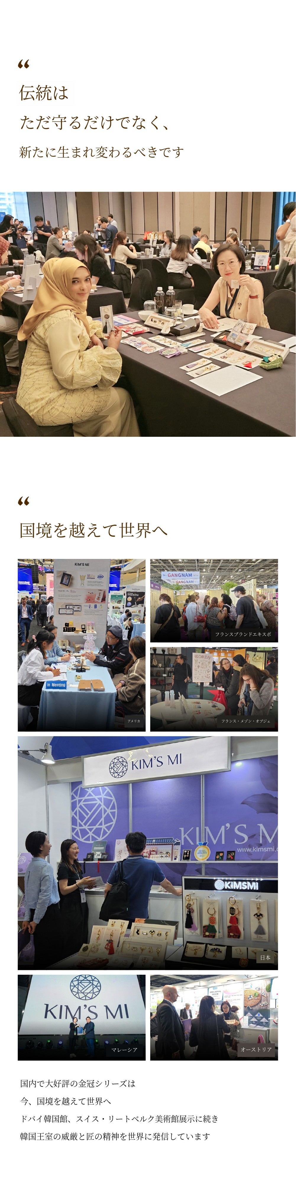 新羅金冠シリーズはその独創的なデザインと優れた品質が認められ、国立中央博物館MU:DSに選定されました。また、KIMSMIはK-Ribbon(優秀文化商品)、国立博物館財団賞、優秀企業人表彰、ソウルアワード、SEOUL MY SOULグッズ選定、女性発明大会金賞など、様々な受賞と認証を通じてブランドの専門性と価値を堅固に築いています。