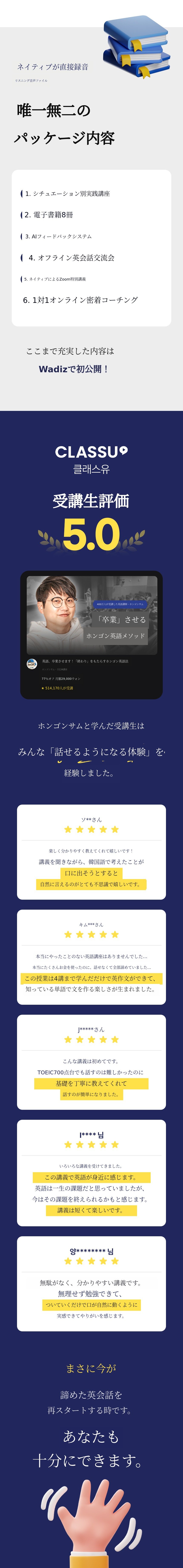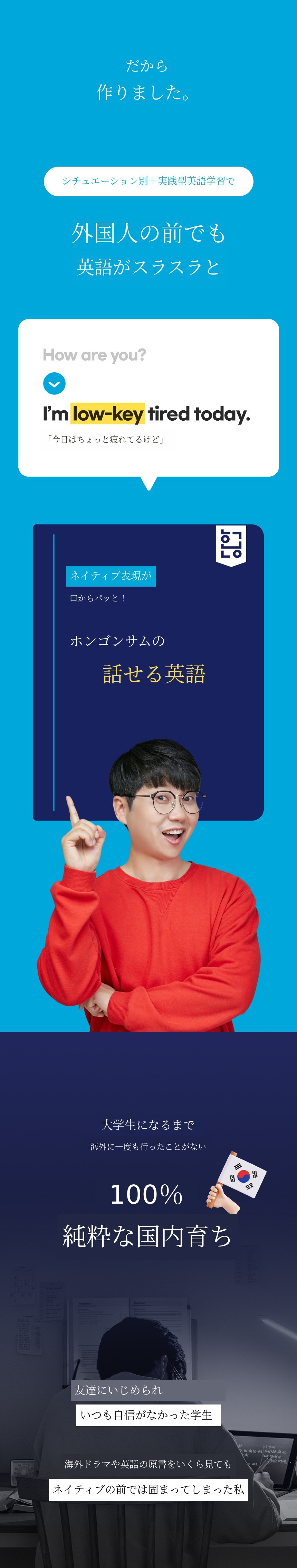 저는 중학교 때부터 학교 폭력을 당하며 힘들게 학교생활을 한 학생이었습니다. 지방에서 태어나 자랐고, 잘하는 게 없어 늘 괴로운 삶을 살았습니다. 그러던 어느 날, 영어 시간에 들은 원어민의 목소리에 매료되어 영어 읽기를 시작했습니다. 영어를 통해 자신감을 얻으면서, 지금은 어떤 순간에도 포기하지 않고 도전하는 어른이 되었습니다. 지금도 외국인과 소통하는 게 즐겁기만 합니다.