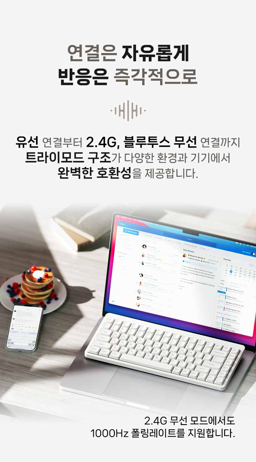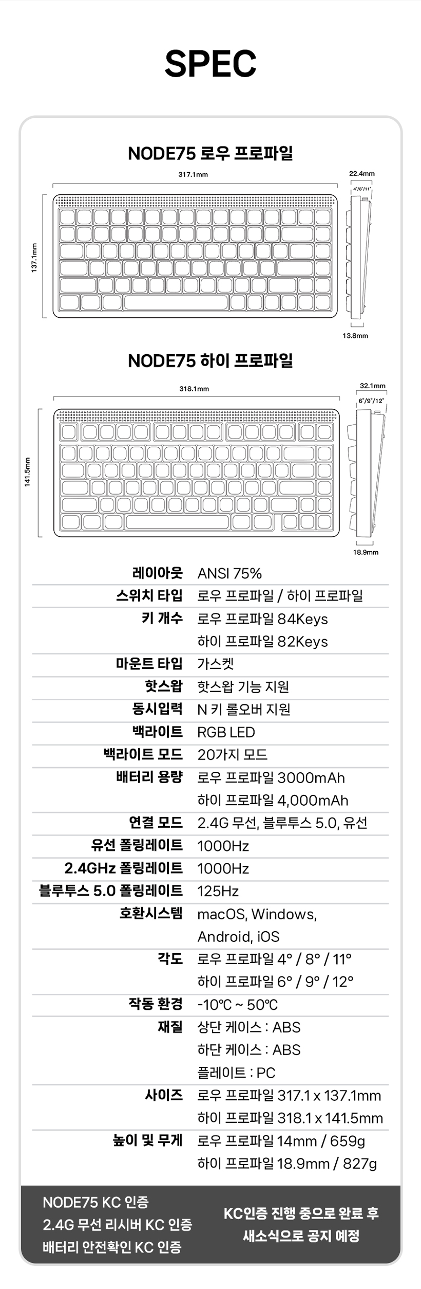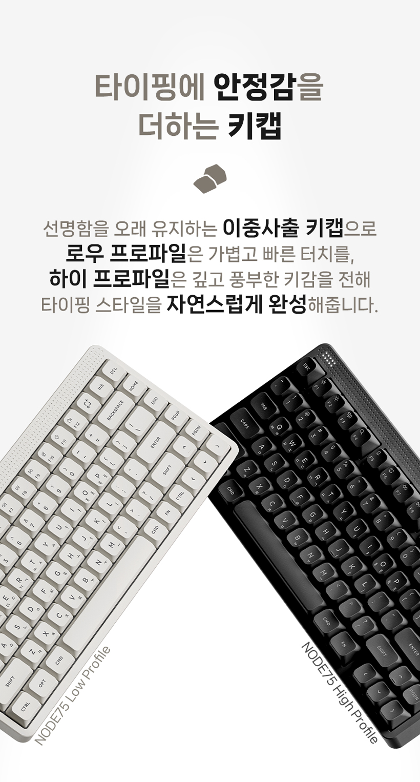 NODE 시리즈는 블루투스, 2.4g 동글, 유선 모드를 모두 지원합니다. 따라서 사용하는 환경에 맞게 유저 분들께서 연결 모드를 선택하여 자유롭게 키보드 타이핑을 즐길 수 있습니다.