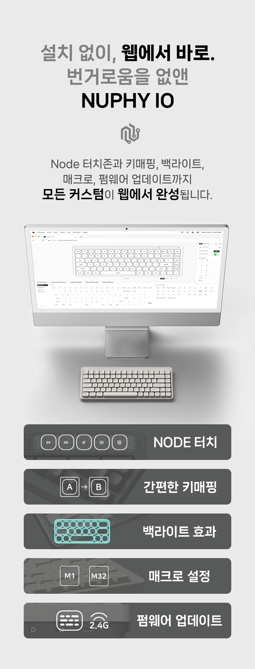 NODE 시리즈는 NUPHY IO 전용 웹 대시보드를 이용합니다. 따라서 별도의 설치가 필요없이 웹 브라우저에서 NUPHY IO에 접속한 후 여러 키매핑 기능과 매크로, 펌웨어 업데이트 등을 진행할 수 있습니다. 웹 대시보드는 해당 링크를 통해 접속할 수 있습니다. https://nuphy.io/