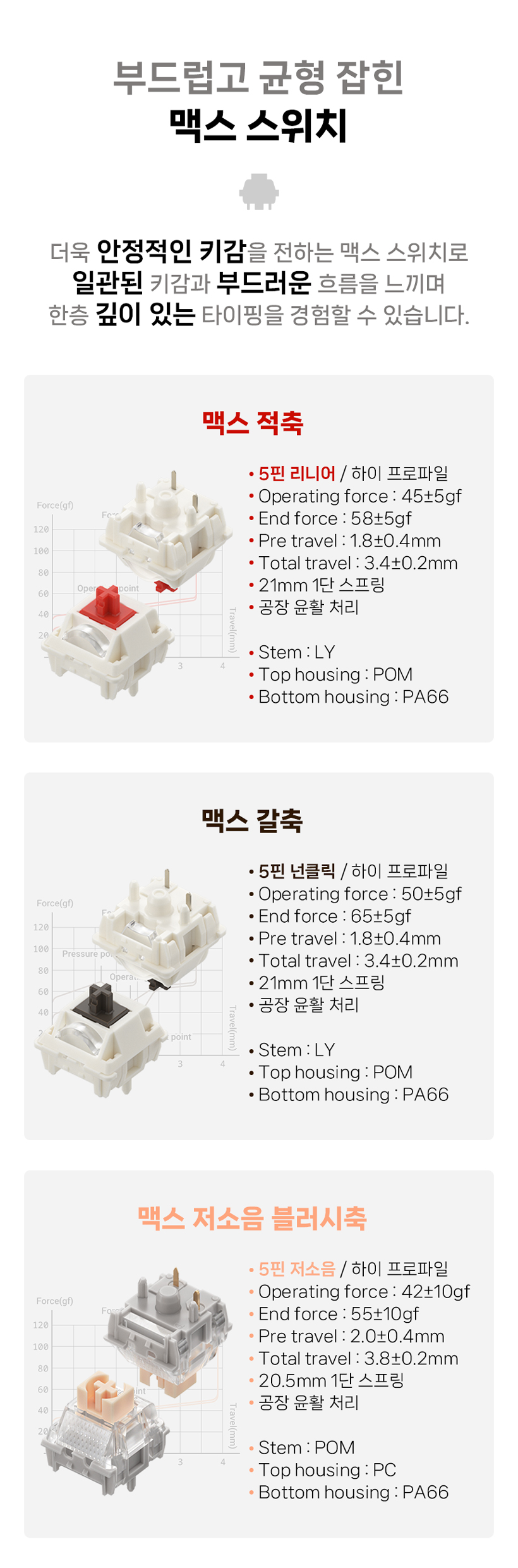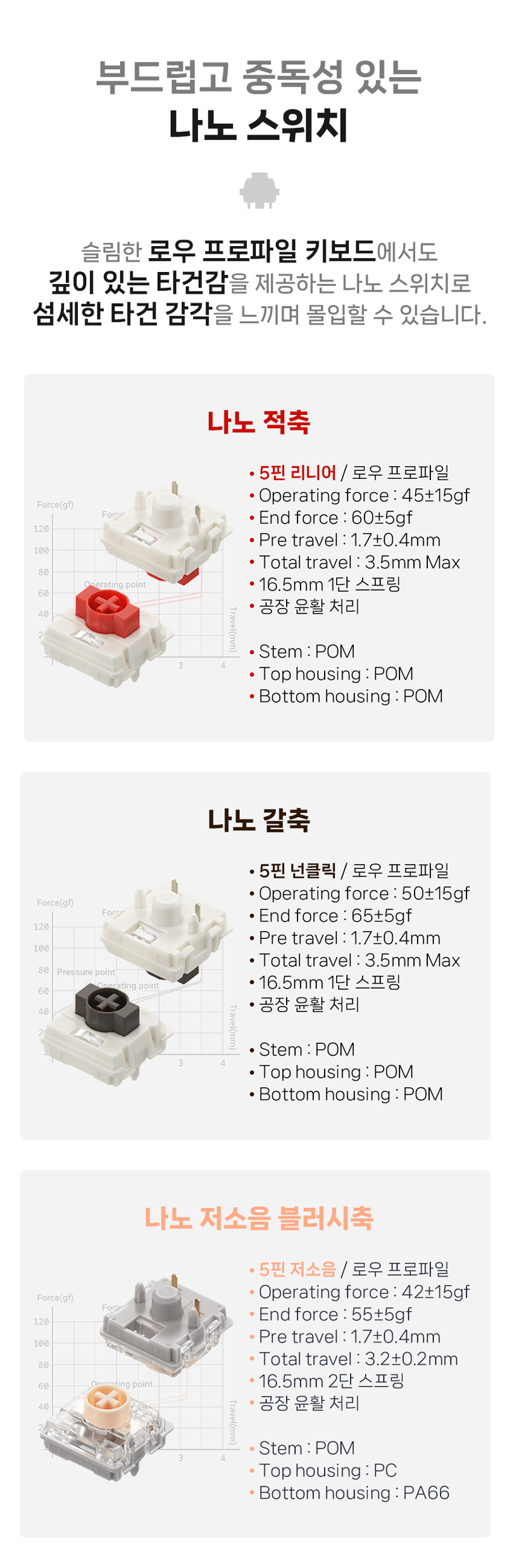 - 기계식키보드 또는 기계식 스위치에 적응 기간이 필요할 수 있습니다. 적응 불가 사유는 제품 하자에 해당되지 않습니다.