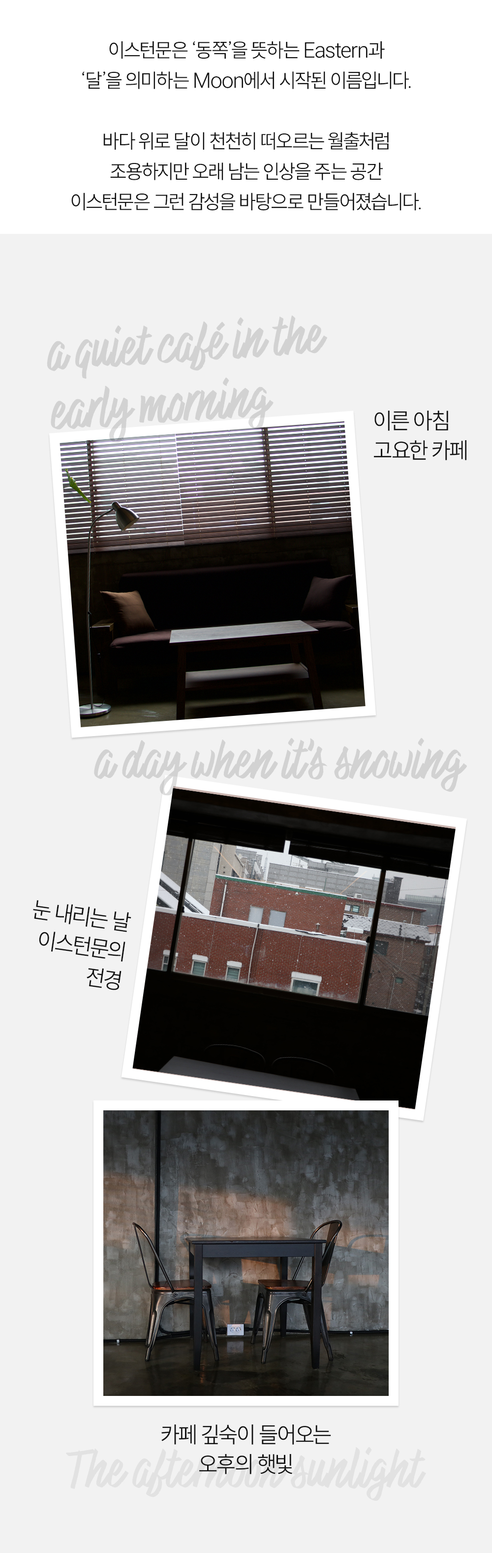 이스턴문은 안산에서 작은 카페를 운영하며 손님들과 나누는 한 잔의 즐거움을 소중히 생각하는 곳입니다.