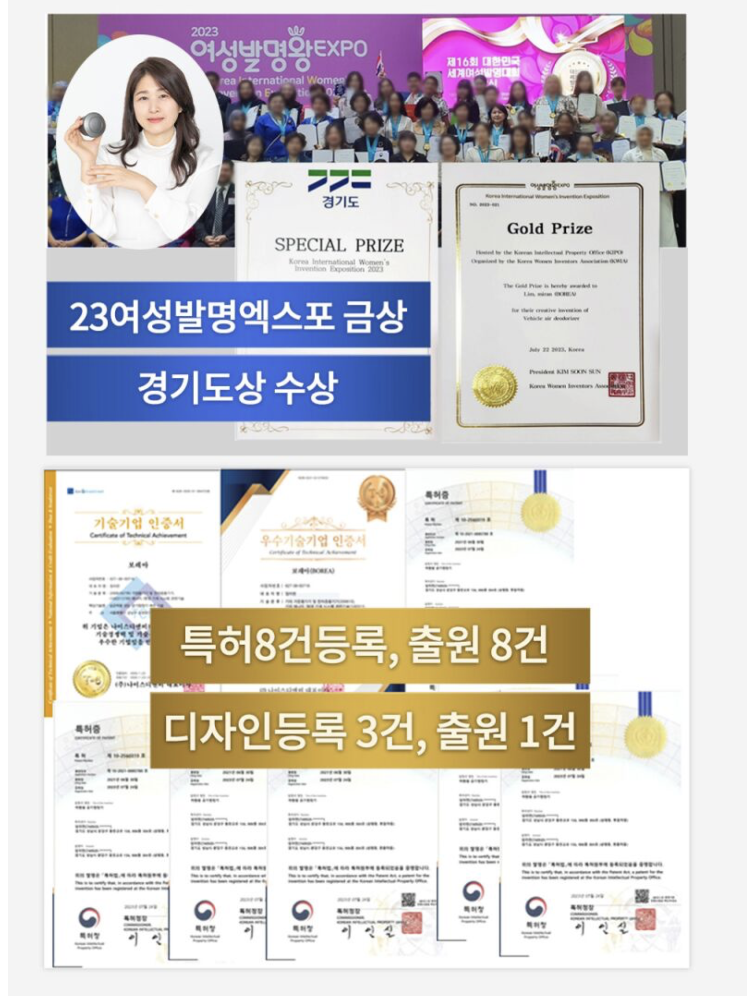 그 과정에서 20 여성발명협회장상, 23여성발명 엑스포 금상,