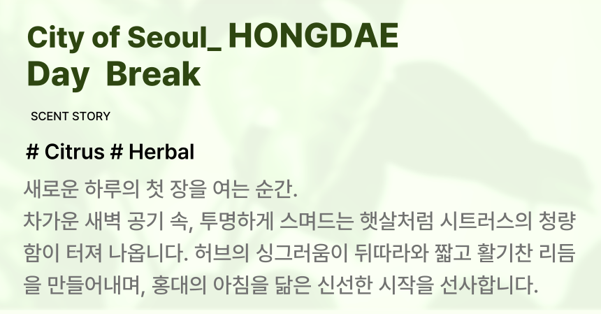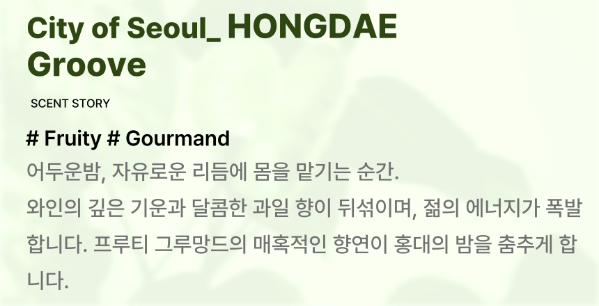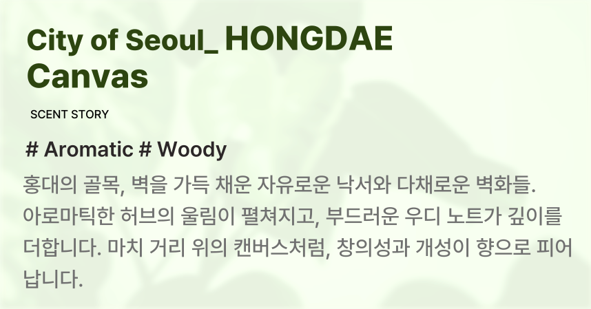 HONGDAE(홍대)는 하나의 향으로 정의할 수 없는 도시입니다.