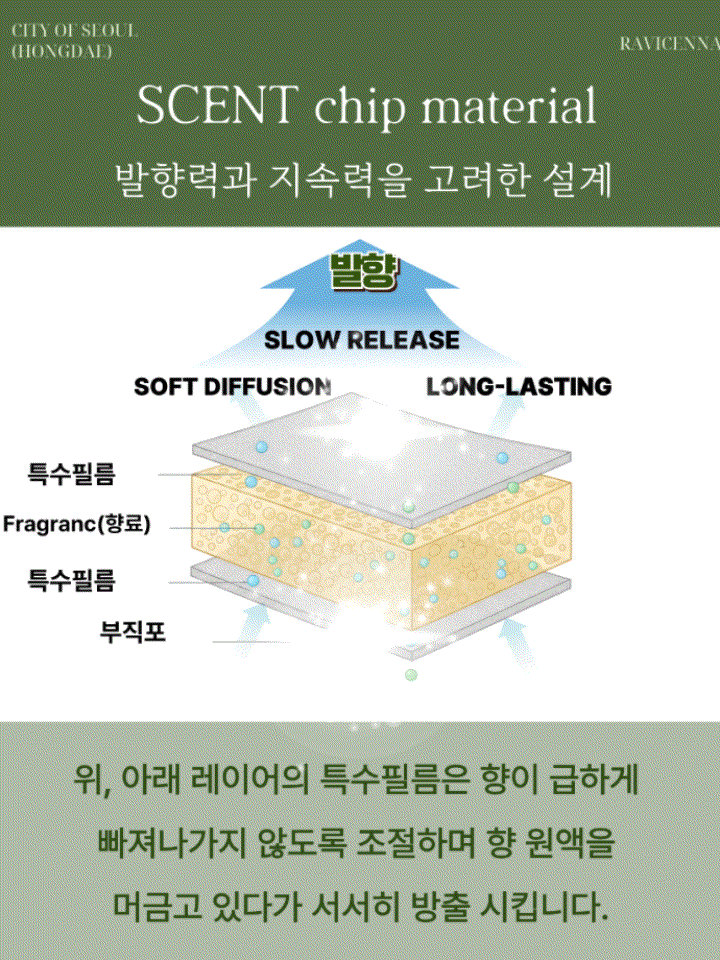 - 은은하지만 오래 가는 향을 위해, 멤브레인을 처음부터 다시 고민했습니다 그래서 향을 ‘머금는 방식’과 ‘내보내는 속도’부터 다르게 설계했습니다.