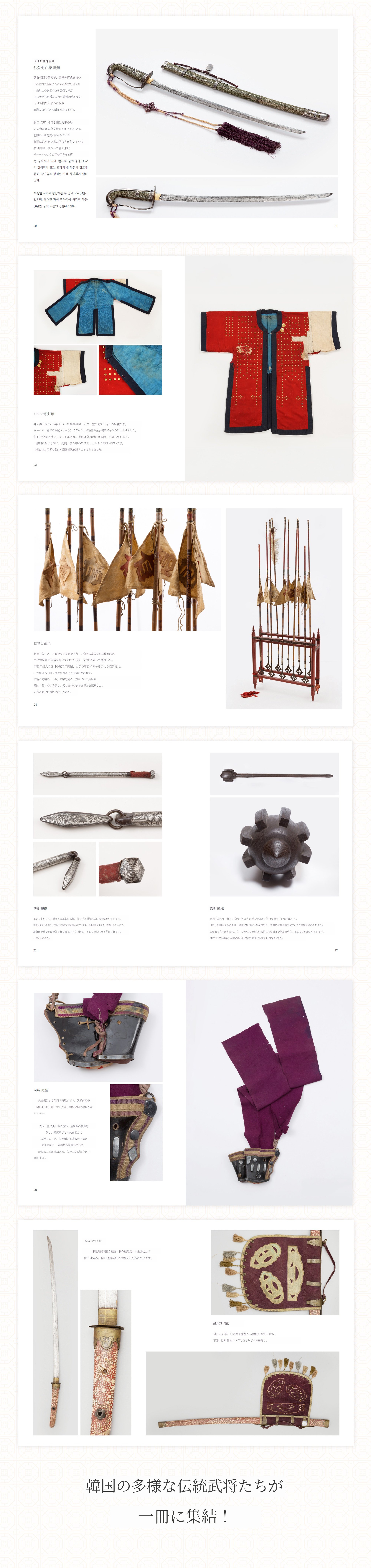刀剣・棍棒・槍・弓などの武器はもちろん、鎧や兜および盾などの防具、軍服・鎧・儀仗・大砲など多様な韓国の輝く伝統武将を一冊に!