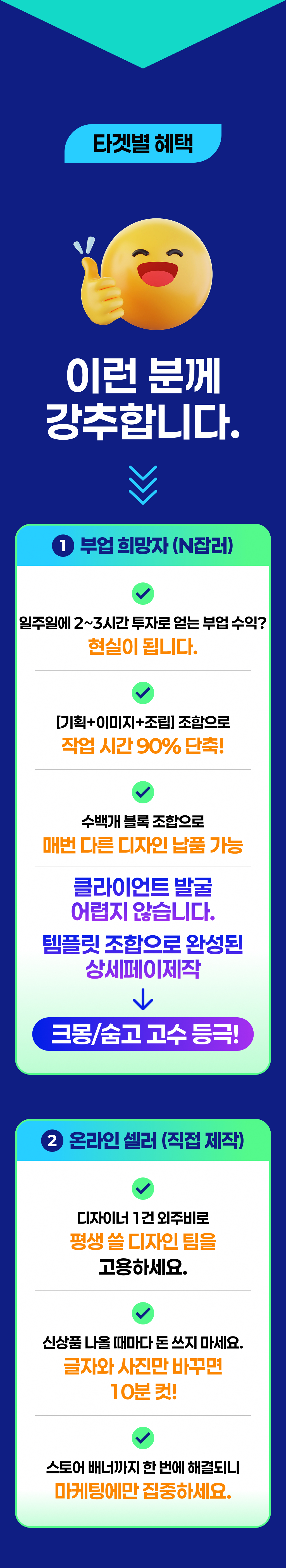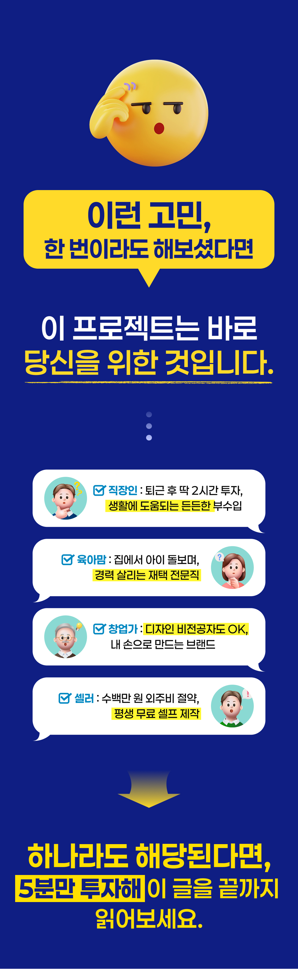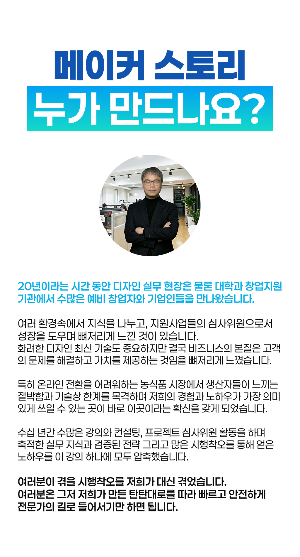 "많은 1인 창업가와 소상공인분들이 훌륭한 제품을 가지고 있음에도 불구하고, 고객을 설득하는 '상세페이지' 제작에 어려움을 겪고 계십니다. 디자인 툴을 다루는 기술적 장벽과 고객의 심리를 꿰뚫는 기획의 부재 때문입니다. 저는 상세페이지 기획 전문가로서, 단순히 예쁜 디자인을 넘어 '팔리는 구조'와 '설득의 논리'가 담긴 솔루션을 제공하여, 초기 창업가들이 겪는 진입 장벽을 낮추고자 이번 프로젝트를 기획하게 되었습니다.
