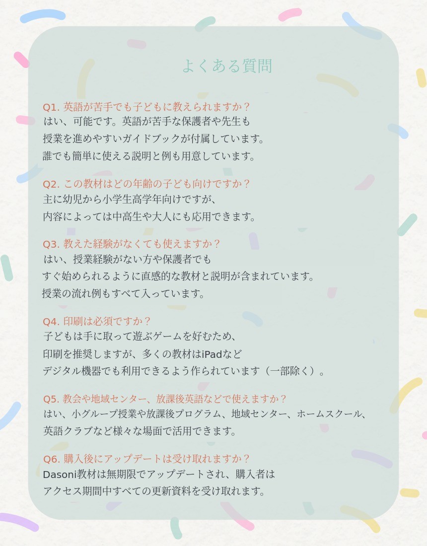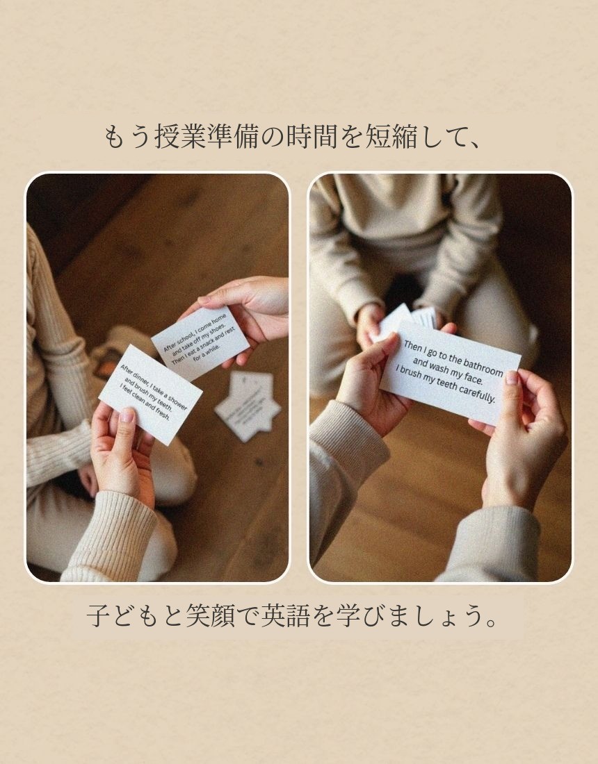 英語教育に慣れていなかったり英会話に自信のない 保護者の方々も一緒に学び、簡単に英語を教えられるように 詳細な説明とガイドブックを追加して作りました。