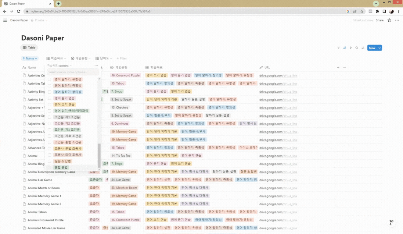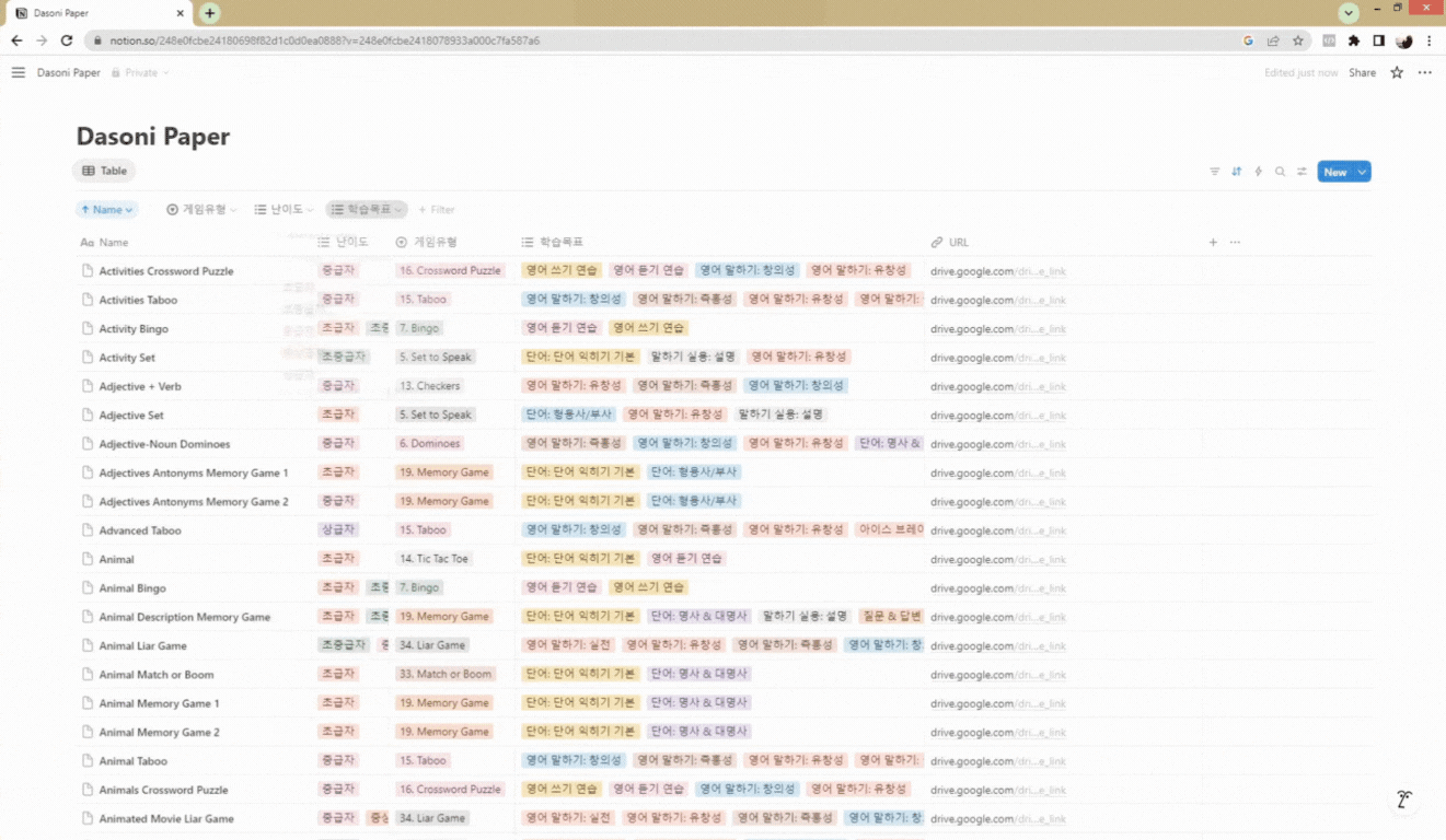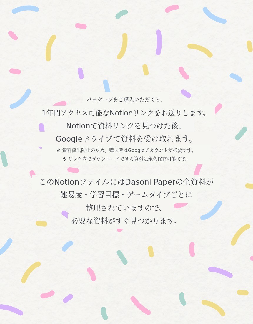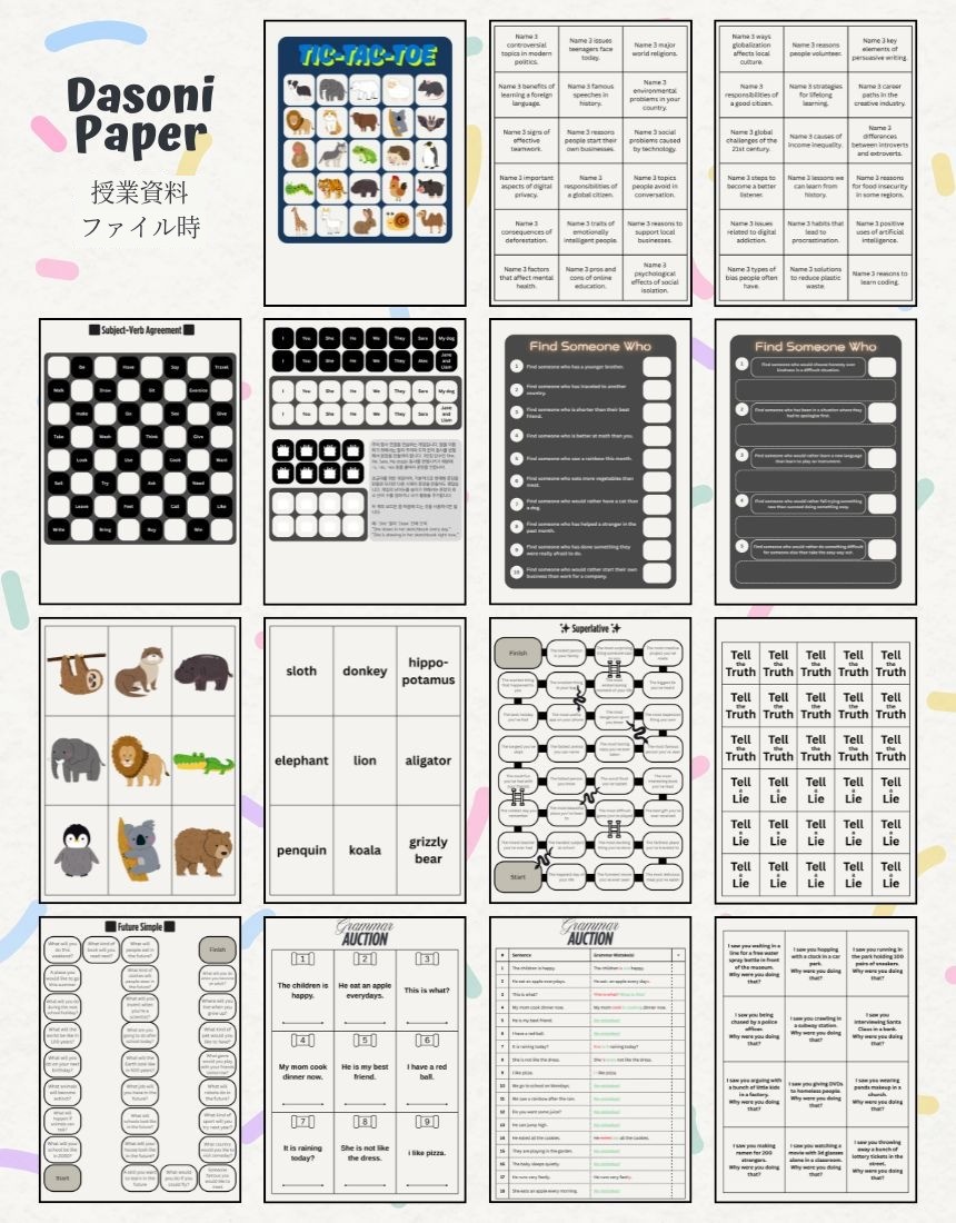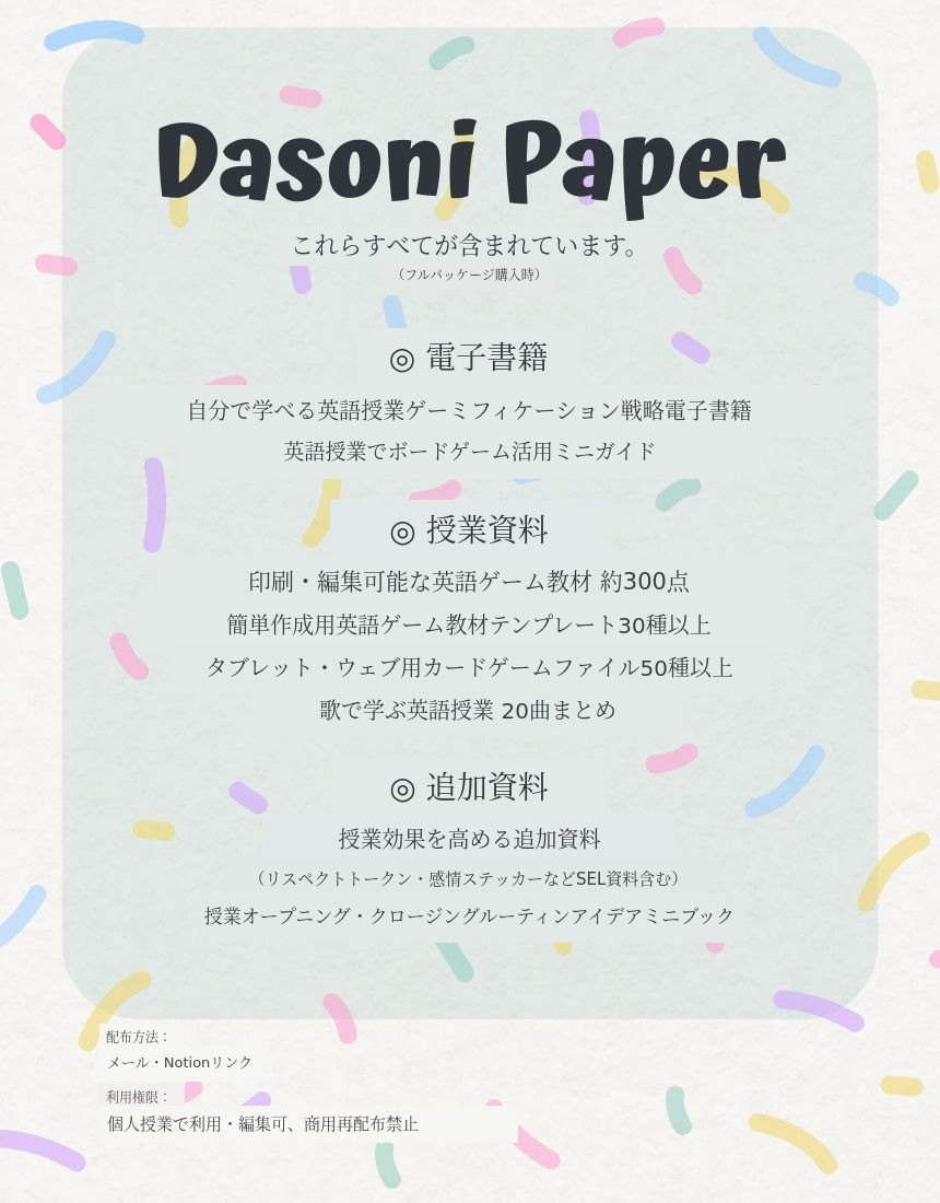 ダソニーペーパーは学習目標と学習者の英語レベル(難易度)、ゲームの種類ごとに整理されています。