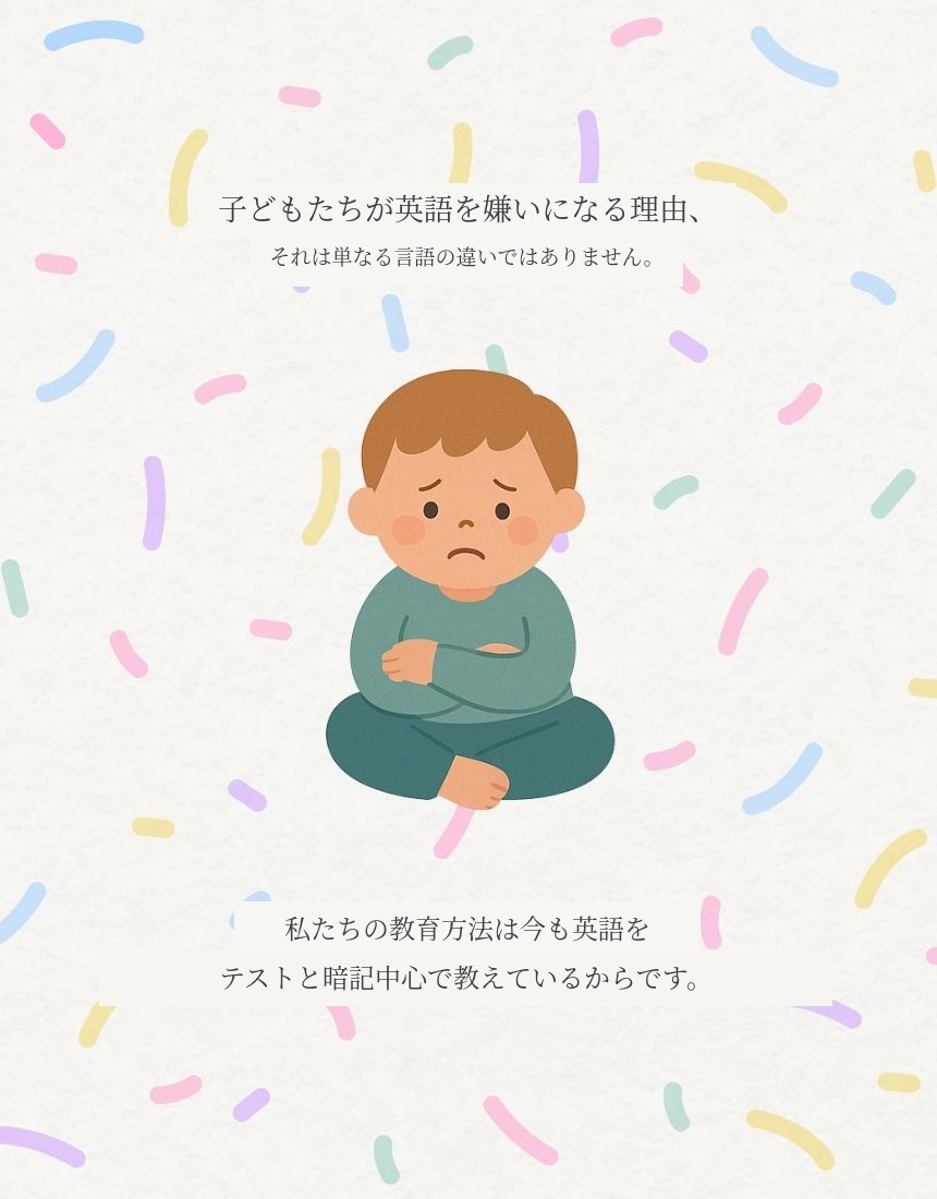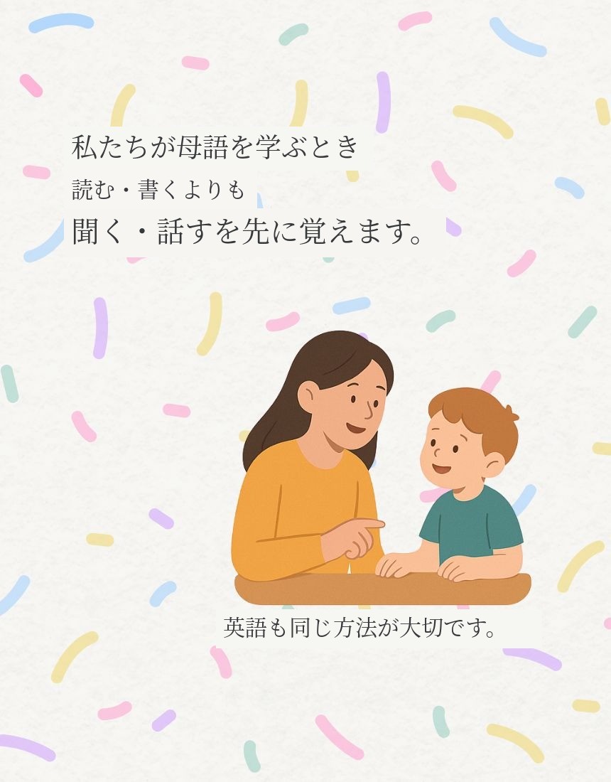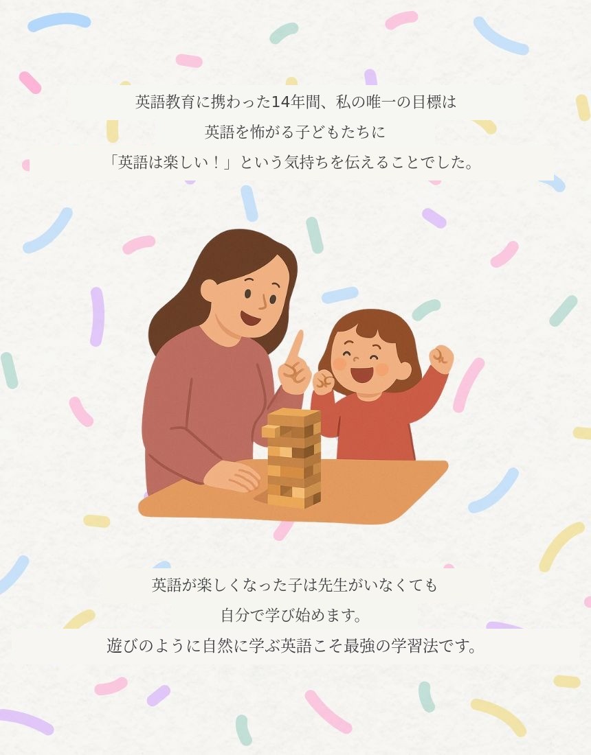 私は何のストレスもなく、ゆっくりと楽しく英語を学び、一度も「つらく勉強している」と感じることなく言語として英語を受け入れた幼い頃の記憶があるからです。