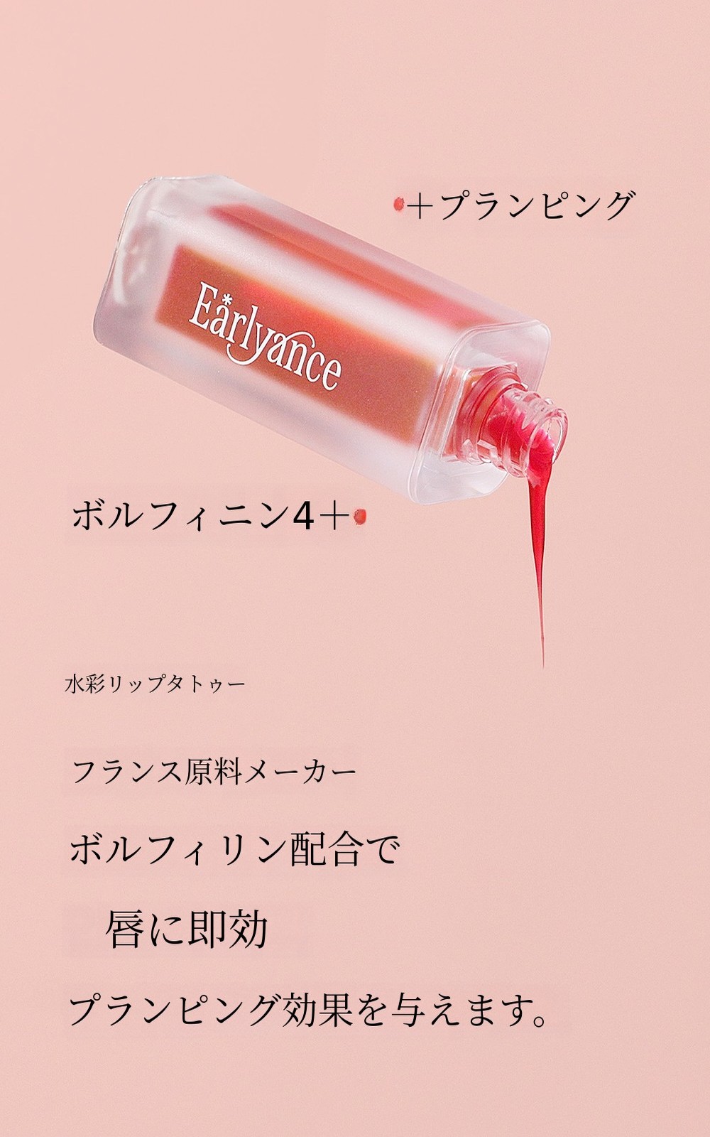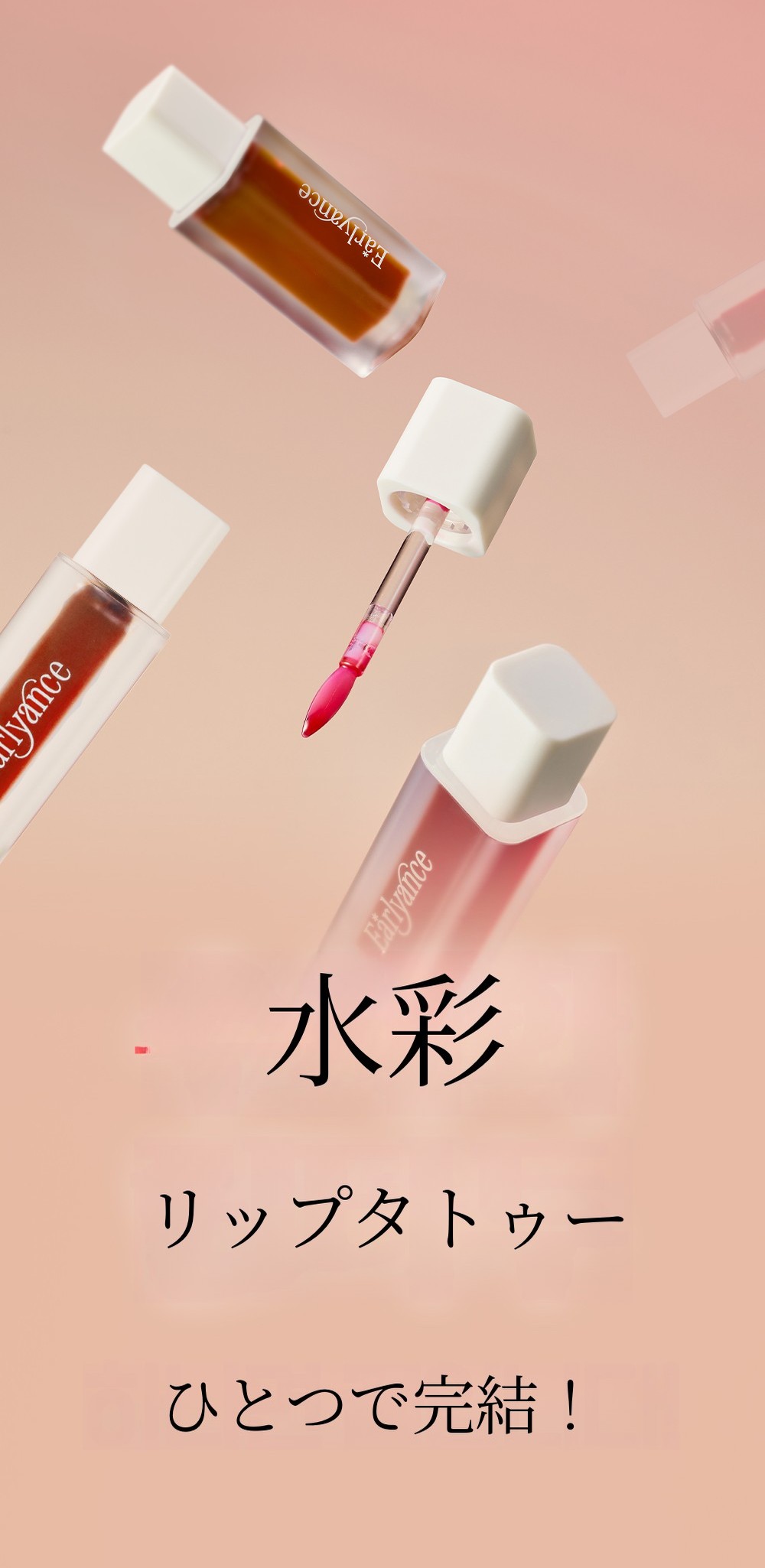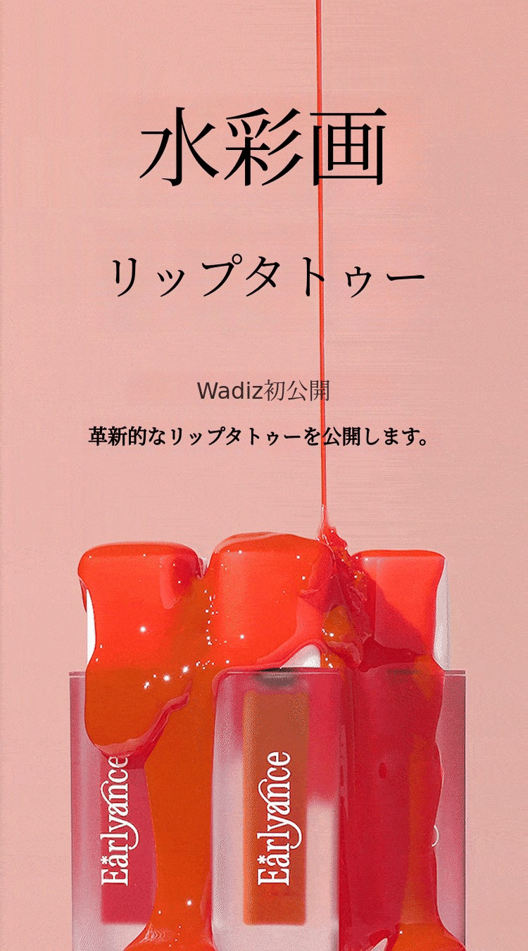 数百のビューティーブランドをコンサルティングし、数千点の製品を使ってきたこの6年間。なぜ私はこの水彩リップタトゥーを企画・開発することになったのでしょうか?理由はシンプルです。毎日メイク台に置いて使える、そして私の日常に欠かせない、そんな製品を作りたかったからです。Earlyanceの水彩リップタトゥーのカラーをひとたび塗れば、代わりになるものはないと感じていただけると思います。塗り方のチップ一つにも、徹底的にこだわりました。