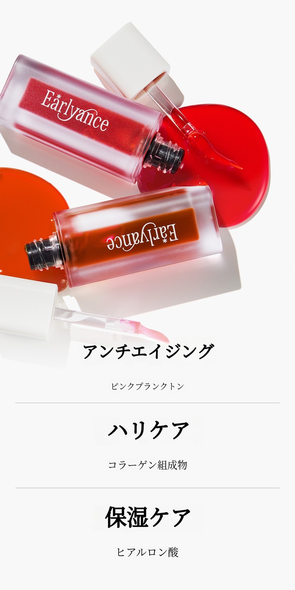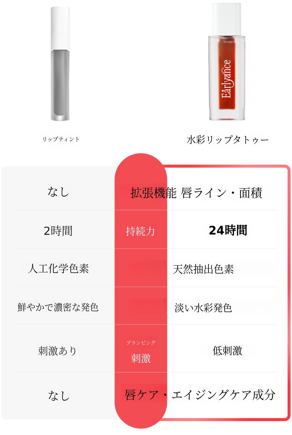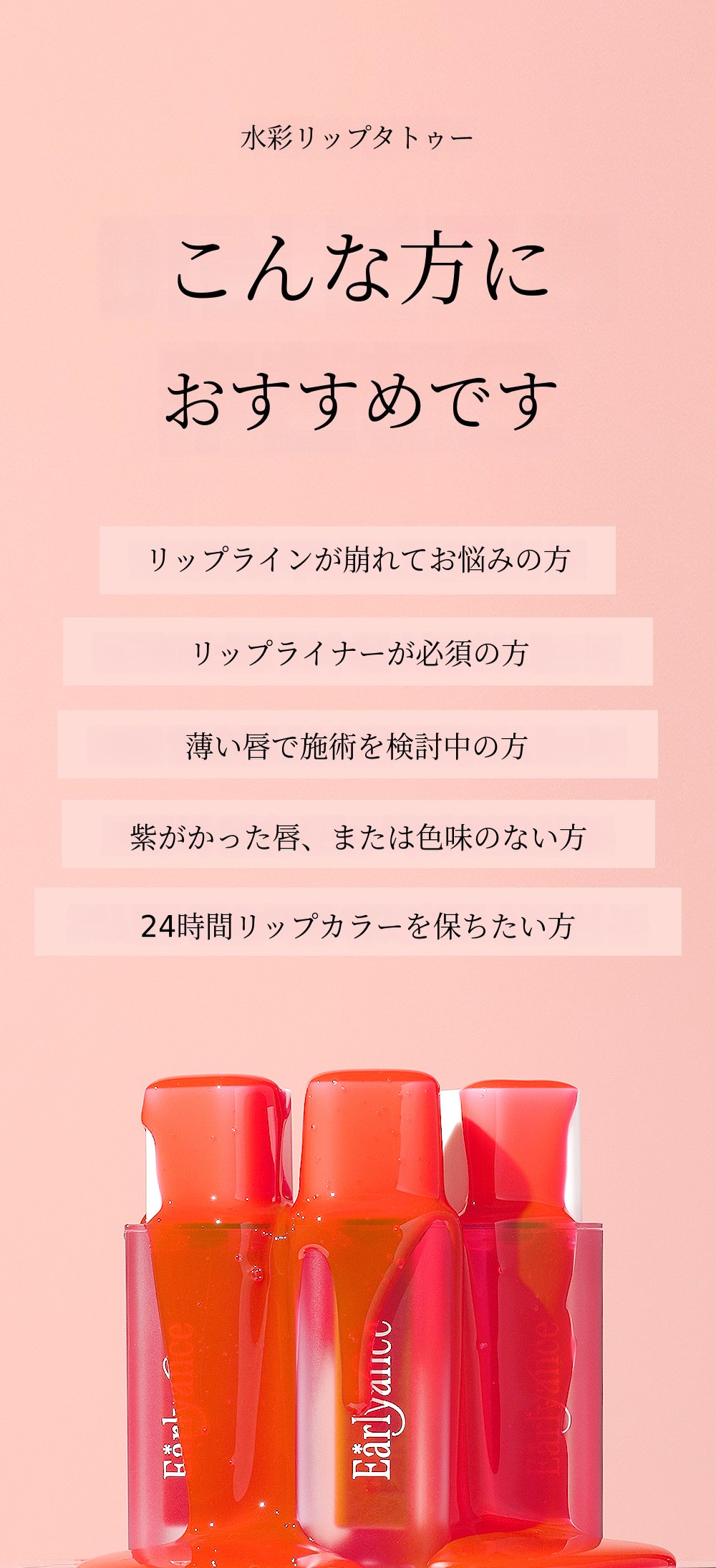 数百のビューティーブランドをコンサルティングし、数千点の製品を使ってきたこの6年間。なぜ私はこの水彩リップタトゥーを企画・開発することになったのでしょうか?理由はシンプルです。毎日メイク台に置いて使える、そして私の日常に欠かせない、そんな製品を作りたかったからです。Earlyanceの水彩リップタトゥーのカラーをひとたび塗れば、代わりになるものはないと感じていただけると思います。塗り方のチップ一つにも、徹底的にこだわりました。