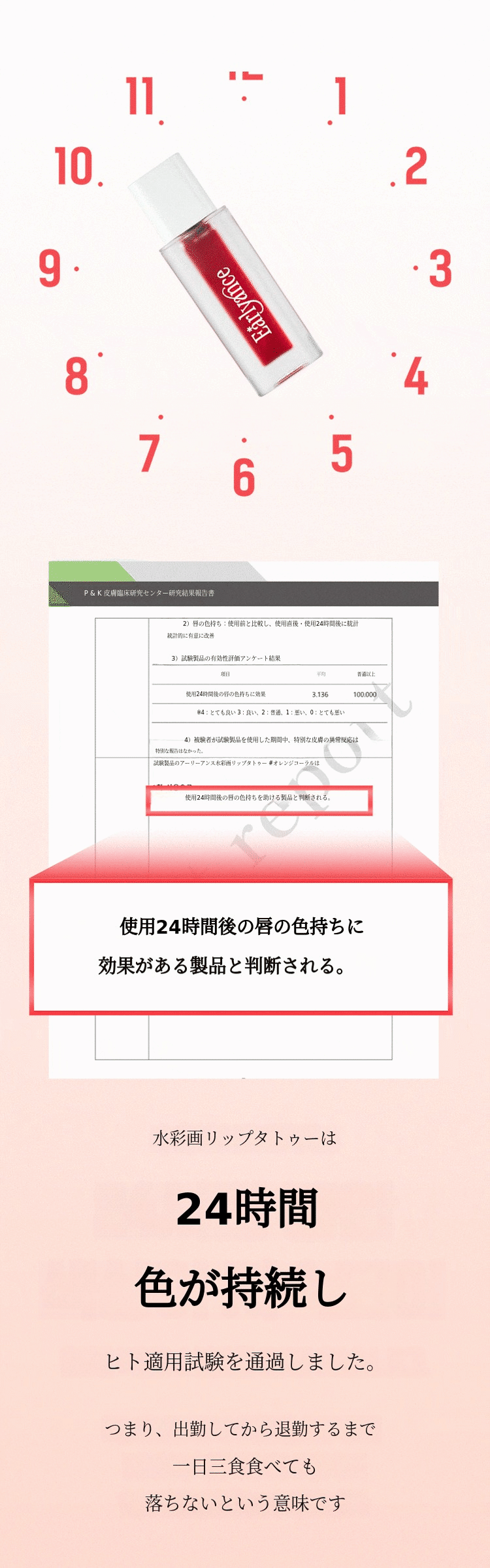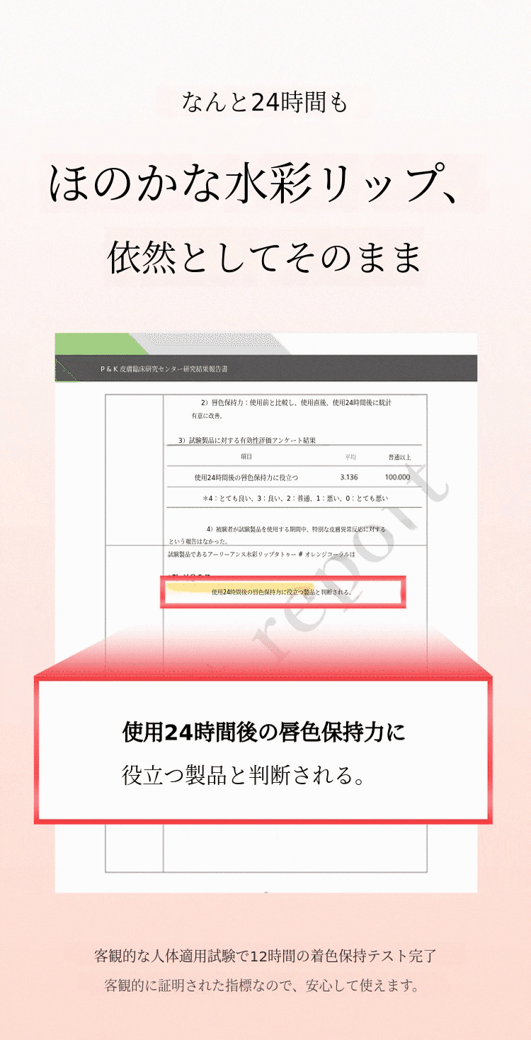 一日中、サポーター様の唇を明るく彩ります。24時間続く染着で、若々しいリップラインを崩さずキープしてください。