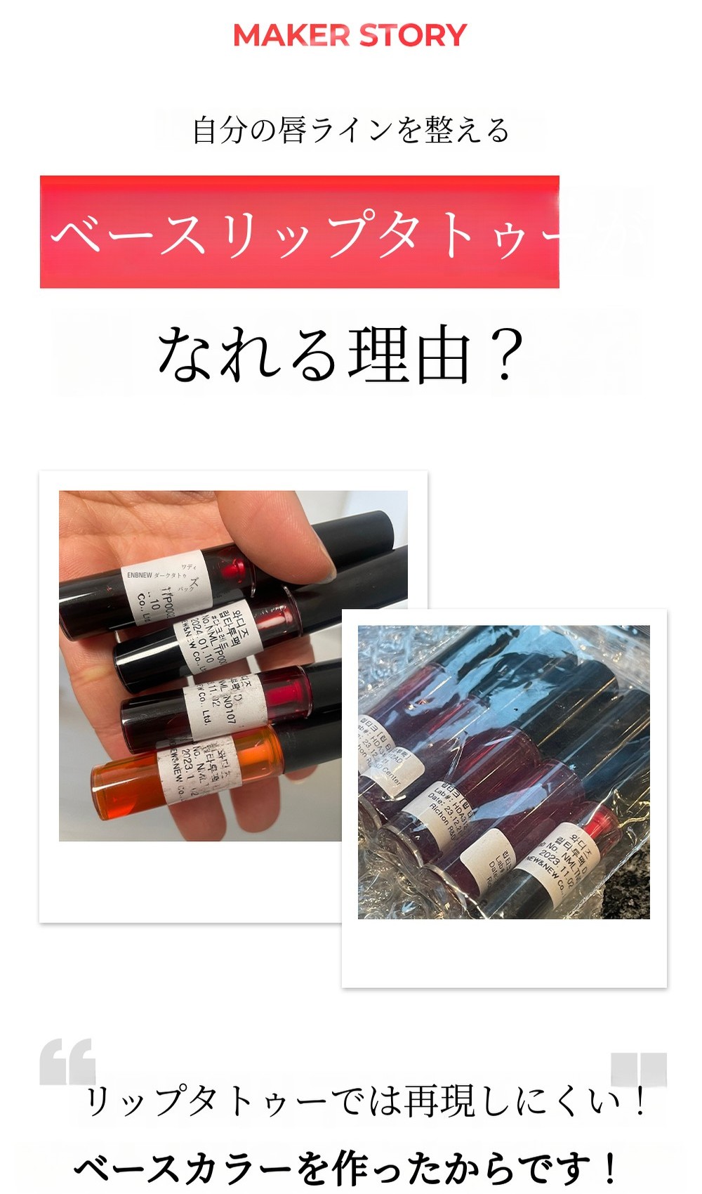 でも、市販のリップタトゥは色が濃すぎて重たく感じてしまい、本当に自然な発色を実現できるリップタトゥのために研究を始めました!