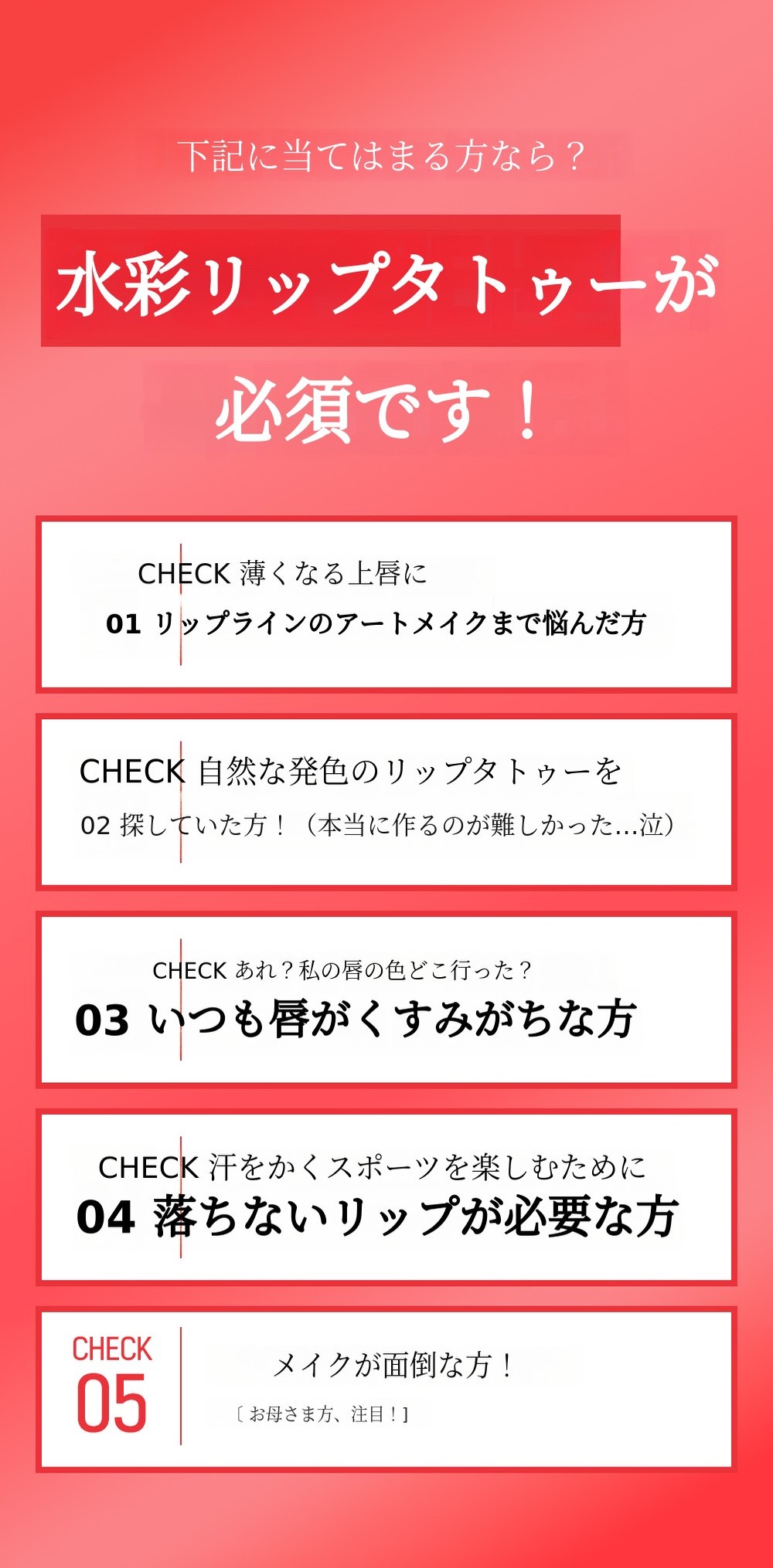 タトゥーでは再現がとても難しいと言われるベースカラー5色を、ついに完成!毎回消えてしまうリップライナーなしでも24時間持続し、より鮮明に仕上げます。